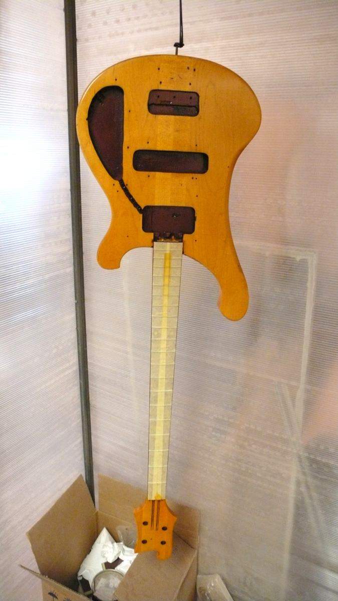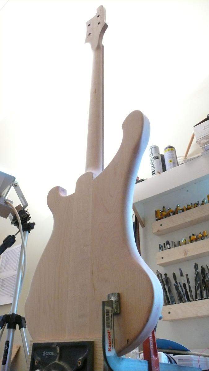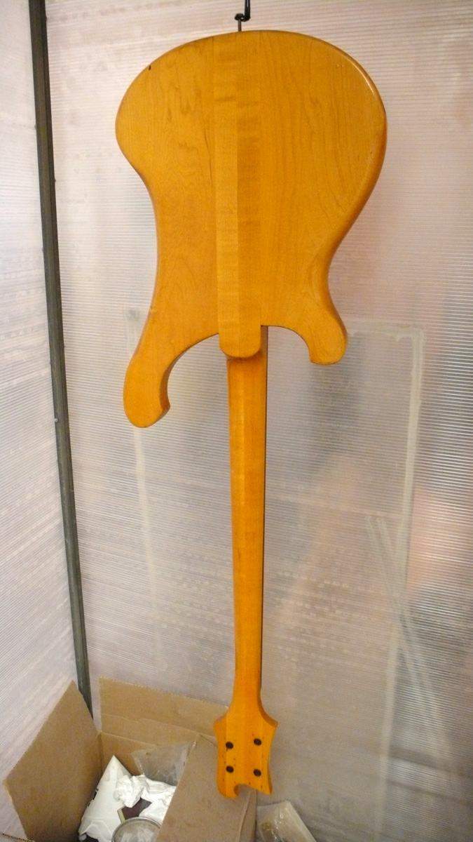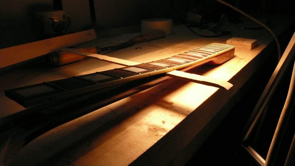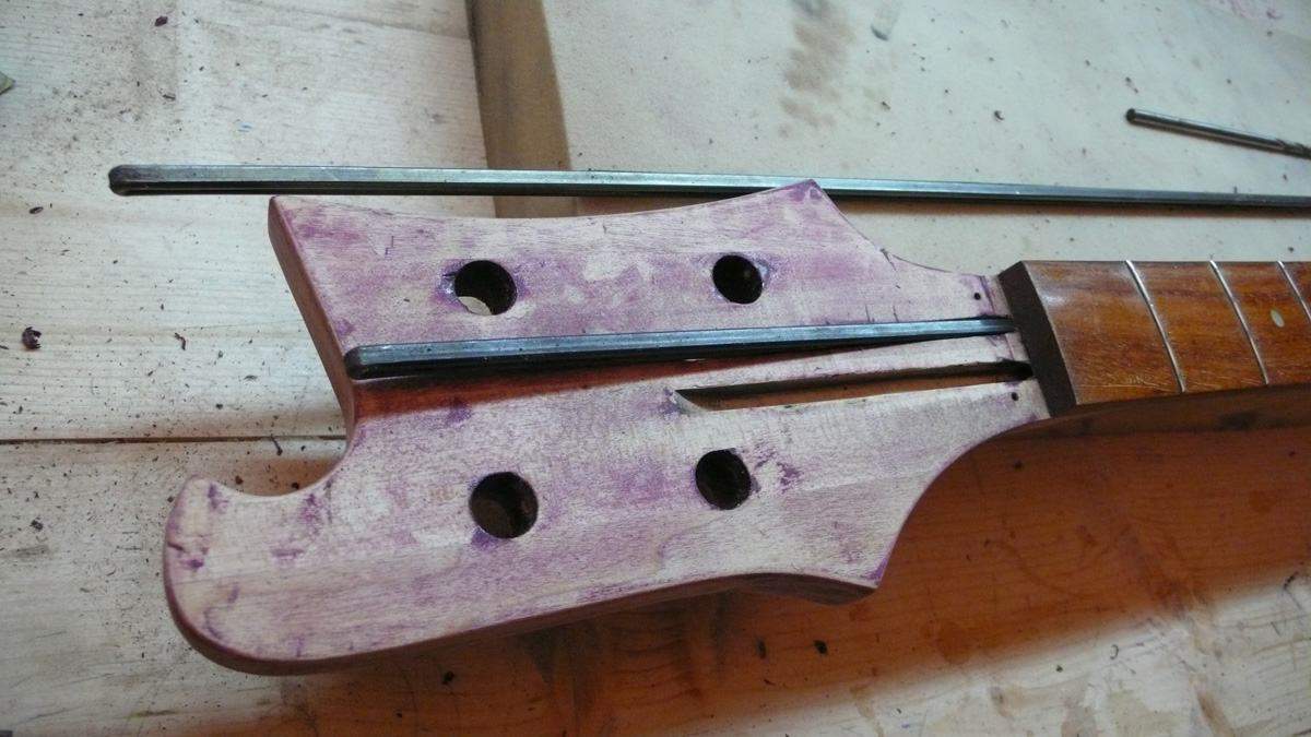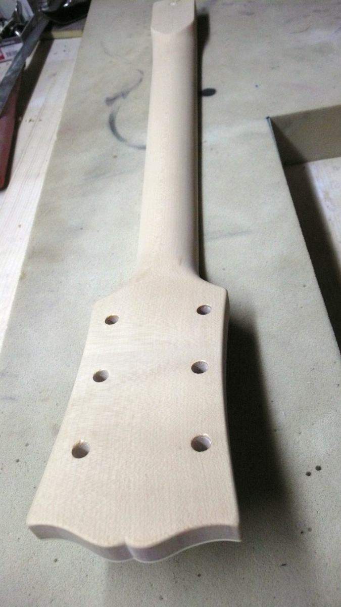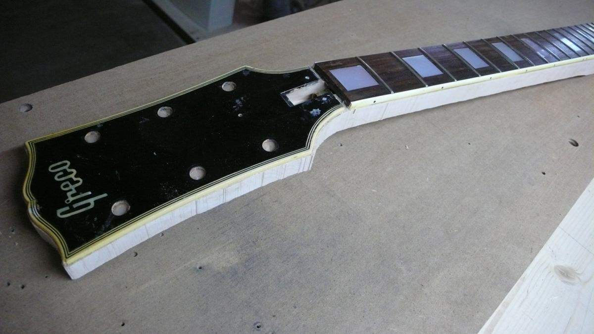 Оторвал накладку, сфрезеровал отделку головы с логотипом и окантовкой и приклеил это все на новый гриф. Сейчас он уже загрунтован, осталось налить цвет и финиш.