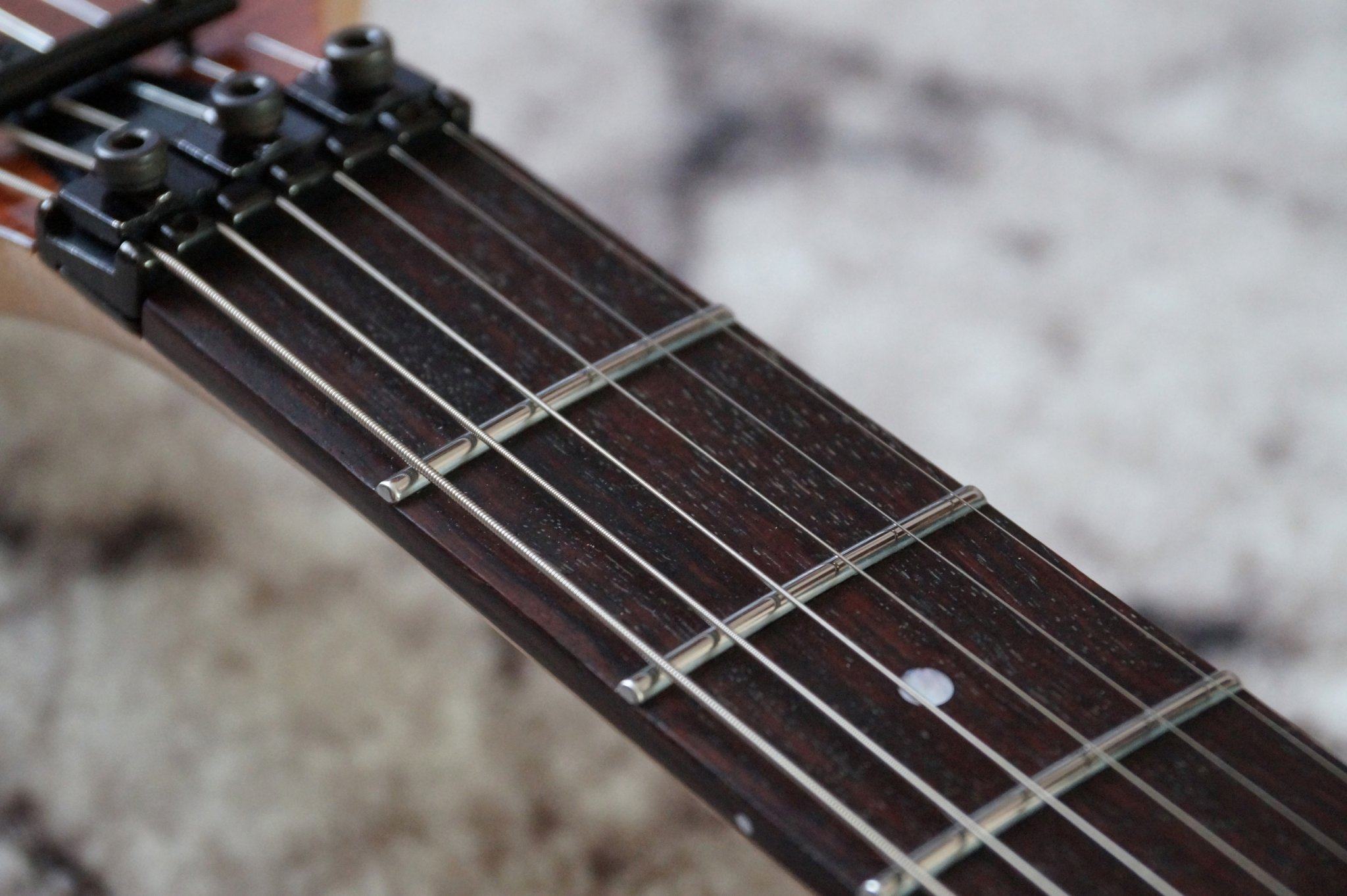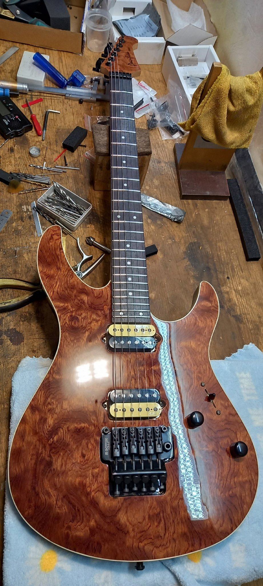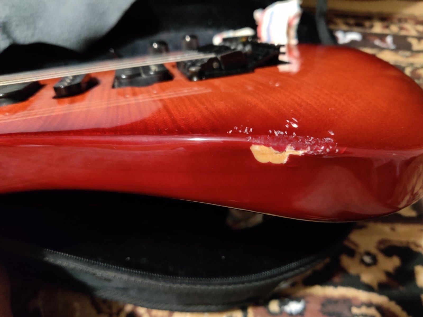 Потом ее уронили из кейса (я виноват в том, что не закрыл молнию). Сохранилась одна фотография скола на ребре, где ложится правая рука. Но нет фото удара в том месте, где находятся ручки потенциометров. Сами ручки поцарапались, а ещё от удара в этом месте раскололся лак, стало похоже на разбитое зеркало. Несколько фрагментов лака выпали. Не исключено, что и топ в этом месте треснул, т.к. он здесь тонкий (там сзади полость под электронику).