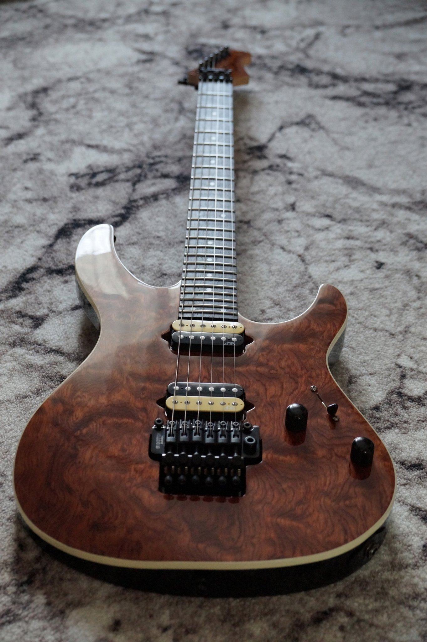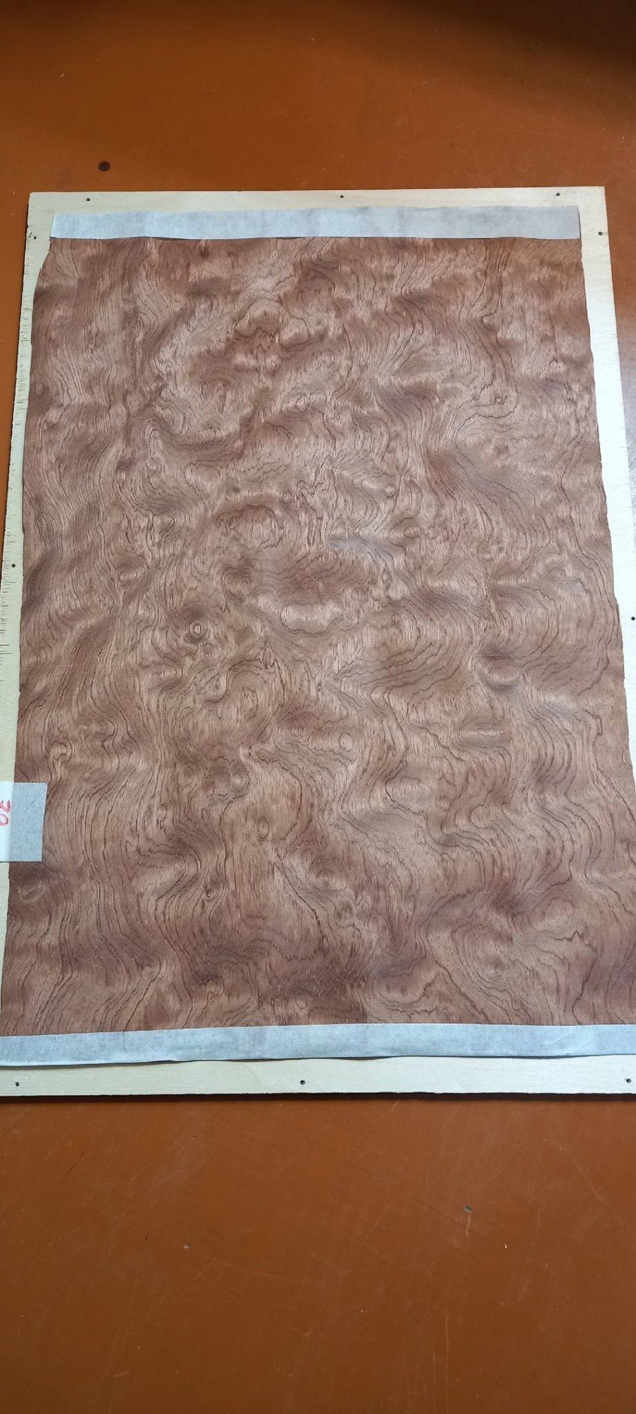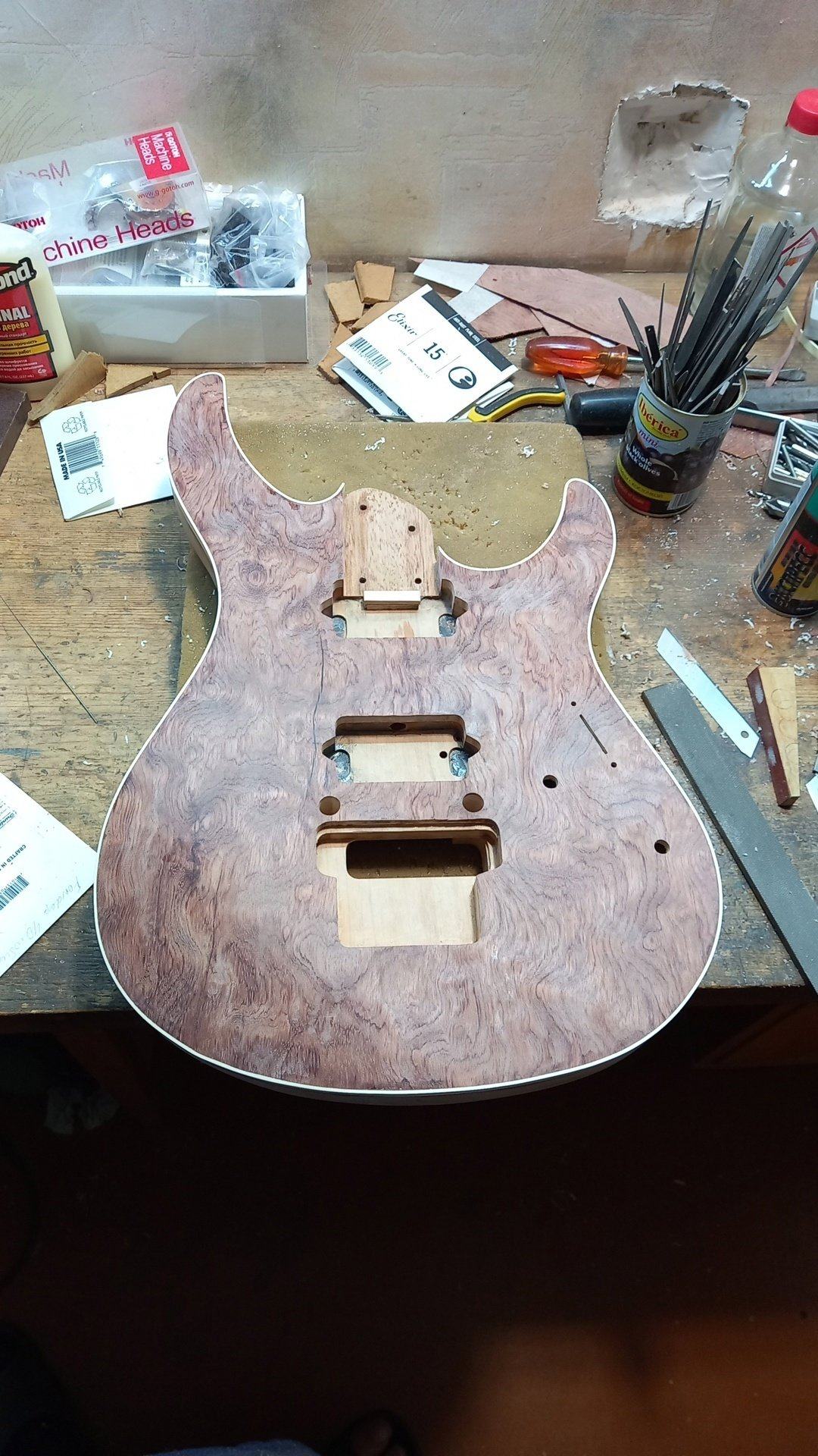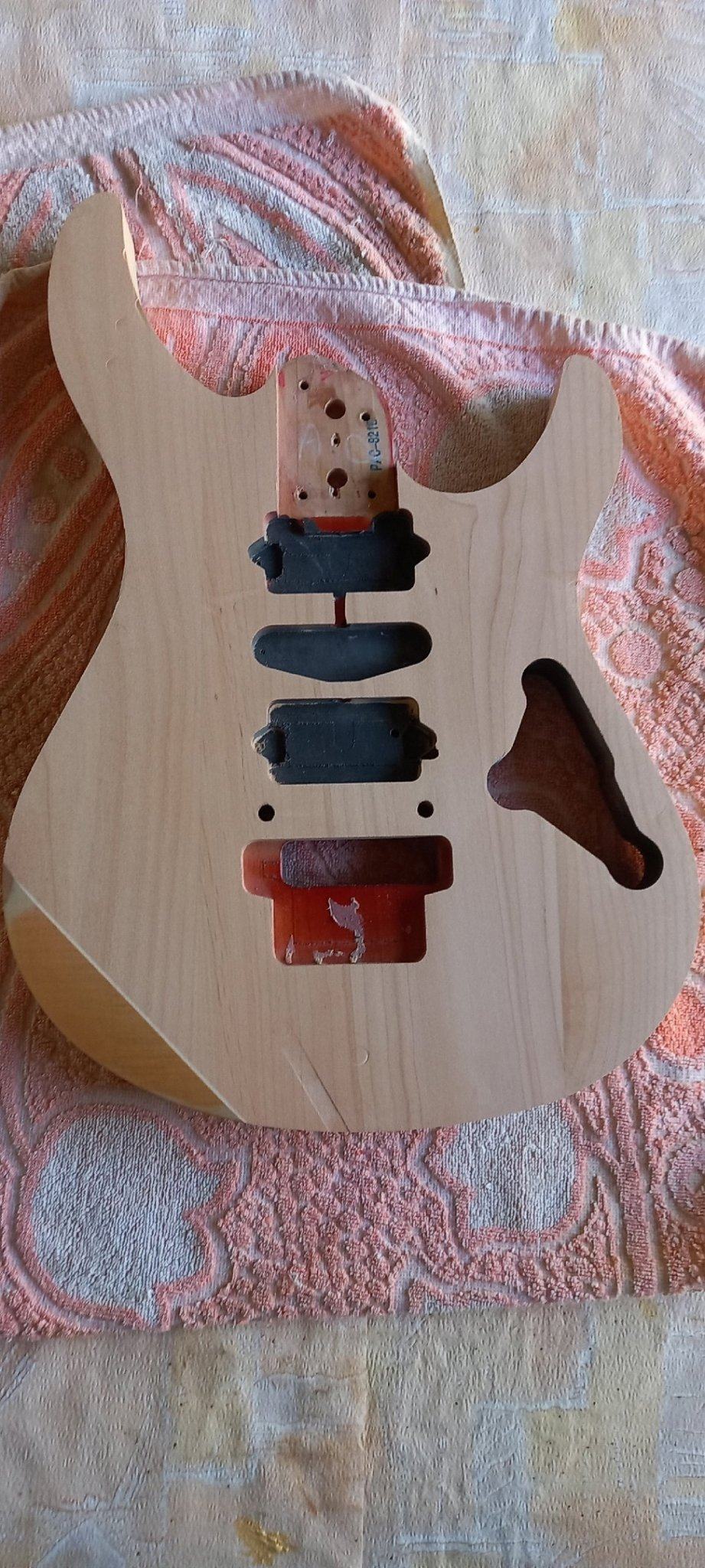 После того, как приклеили топ и были выбраны полости под датчики, было решено переделать саму конструкцию((( На фото из магазина рисунок на досках смотрелся очень здорово, я выбирал разные варианты покраски, чтобы все эти линии волнистого клена были видны, создавая красивый узор. По факту, корпус у Yamaha маленький, да и рисунок оказался не такой выигрышный, поэтому смотрелось так себе. Я решил убрать средний сингл, оставить только два хамбакера, а поверх кленового топа наклеить какое-нибудь экзотическое дерево с красивым рисунком. В итоге, оставновился на бубинго, который купил всё в том же MusicWood.