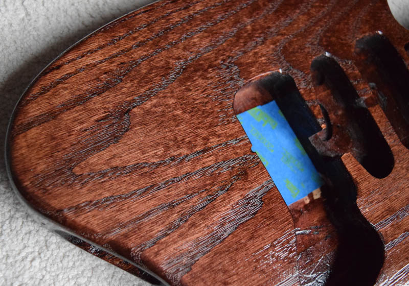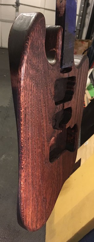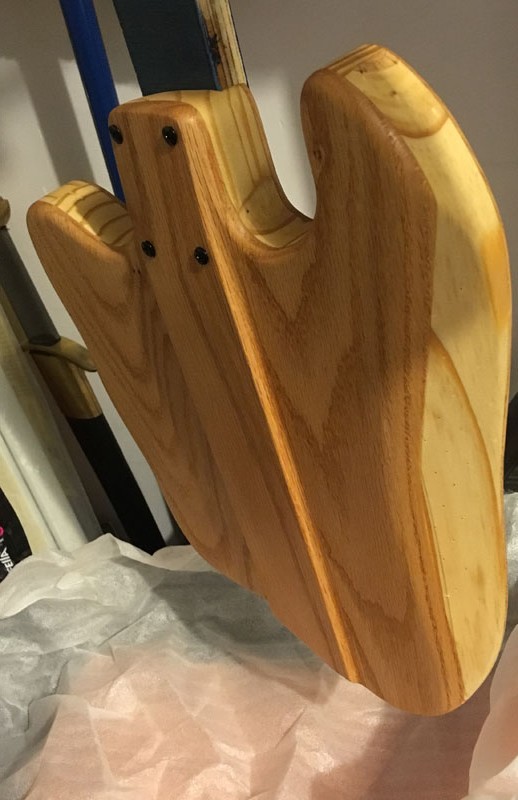 Кстати, всё думал как же нужную глубину выставить, но как раз был разобранный Страт от того же Warmoth, так что воткнул фрезу не затягивая сильно, что бы могла двигаться, но не падать от собственного веса - поставил шаблон на деку и фреза углубилась на нужную глубину, потом затянул гайку и готово - выпилил пробный карман на доске - теперь есть шаблон для выставления глубины.