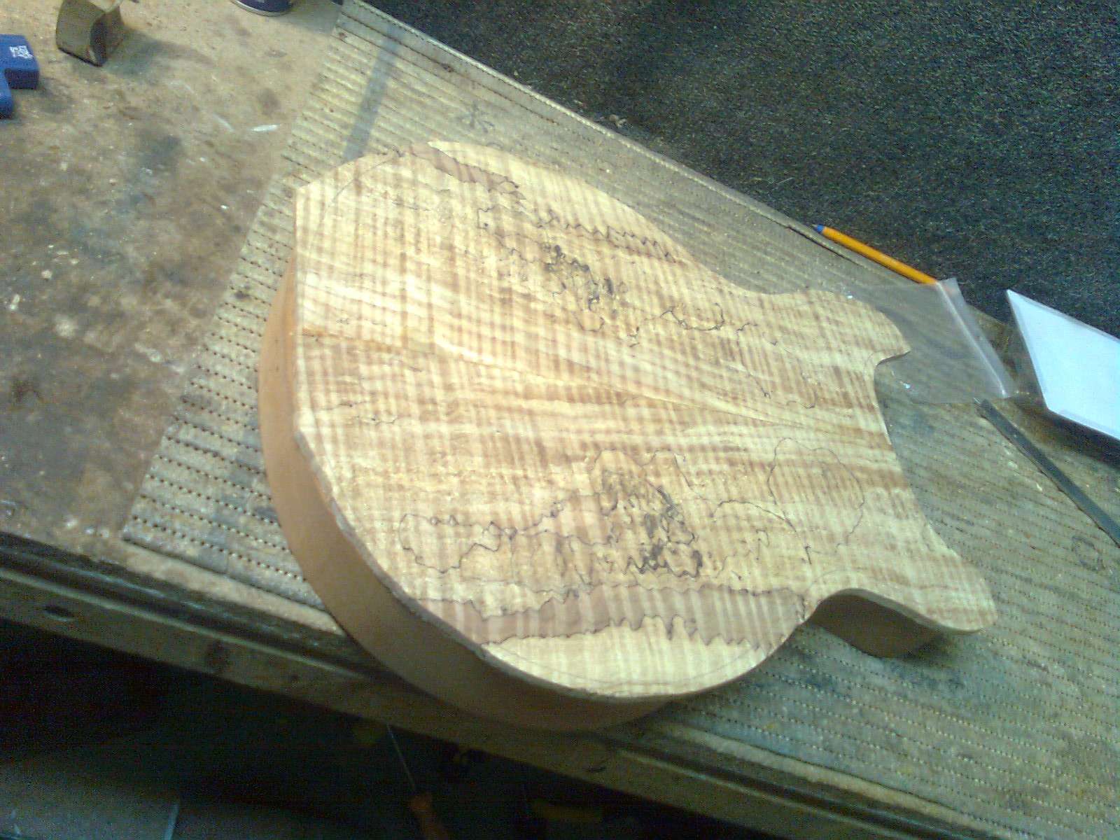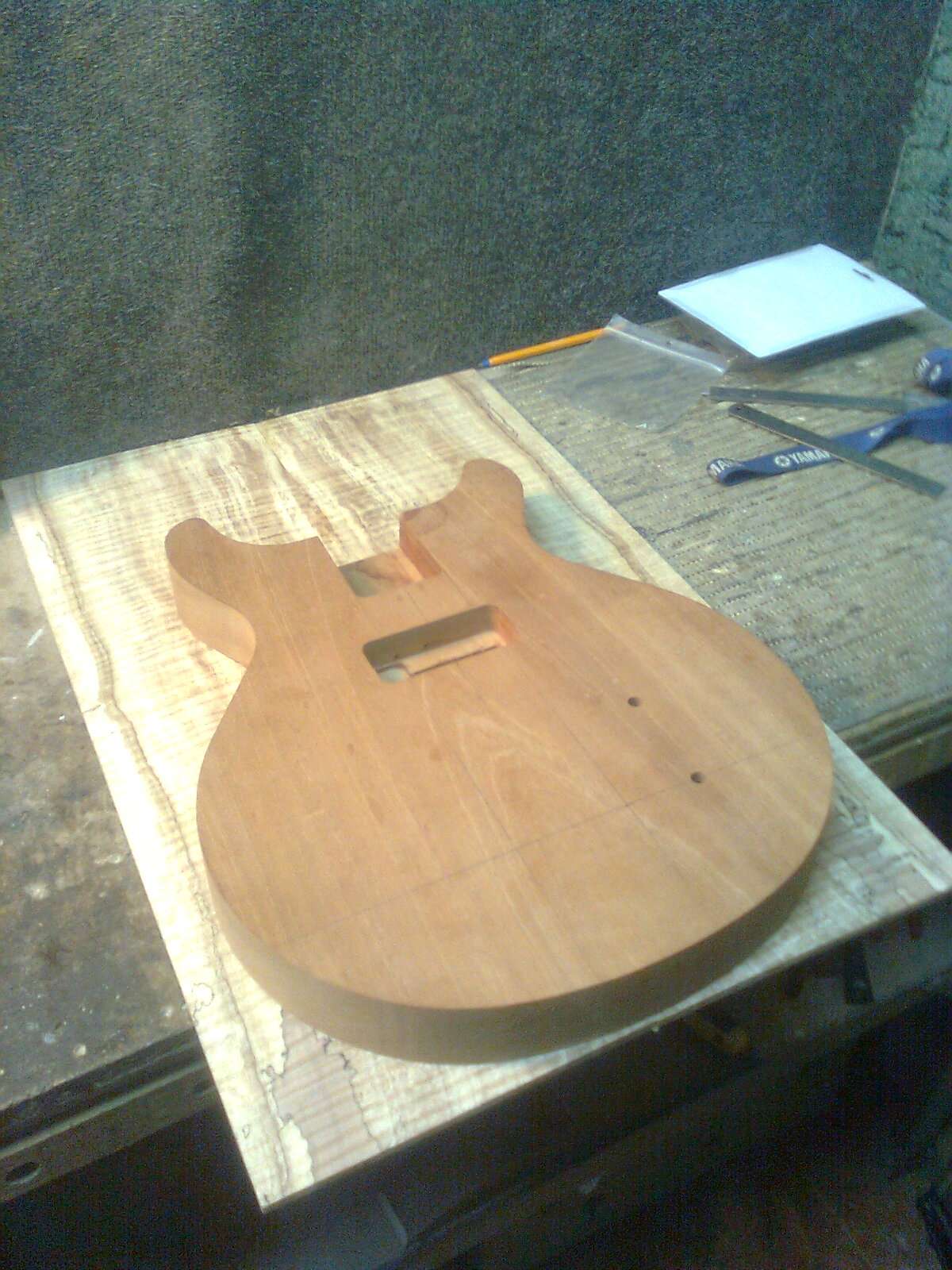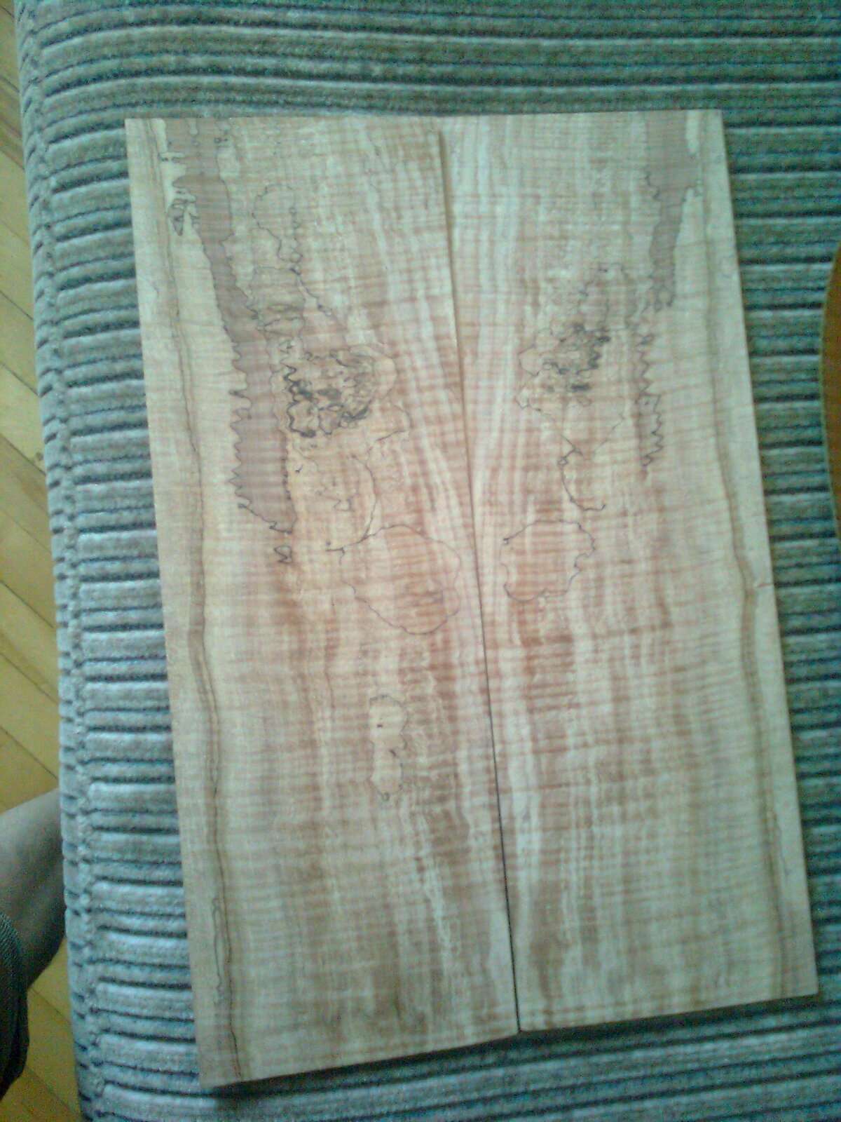 Опыт работы с деревом у меня есть,есть знакомые мастера,правда в основном специализирующиеся на классике,так как на ней большей частью играю.Посоветовали не экономить на материале,в и итоге был куплен гондурасский махагон на гриф и корпус,базильский палисандр на накладку и для красоты Spalted клён на топ.Корпус купил вырезанный по форме и с фрезеровками,но не с теми которые мне нужны,скорее полуфабрикат.Это единственное во всём проэкте что делал не сам.На гриф брусок темней чем на корпус очень приятно гудел на простук.Он будет глубоко вклеен,идею подсмотрел вот тут