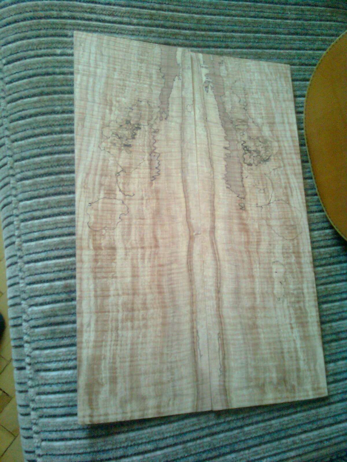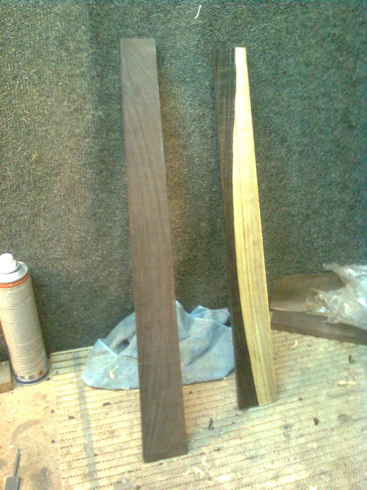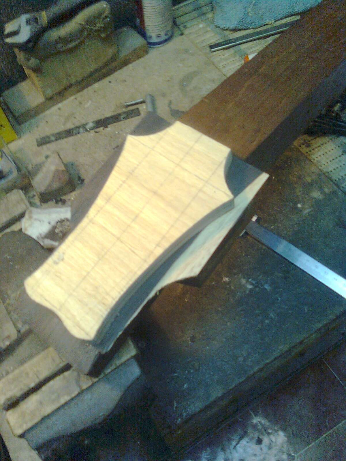 Опыт работы с деревом у меня есть,есть знакомые мастера,правда в основном специализирующиеся на классике,так как на ней большей частью играю.Посоветовали не экономить на материале,в и итоге был куплен гондурасский махагон на гриф и корпус,базильский палисандр на накладку и для красоты Spalted клён на топ.Корпус купил вырезанный по форме и с фрезеровками,но не с теми которые мне нужны,скорее полуфабрикат.Это единственное во всём проэкте что делал не сам.На гриф брусок темней чем на корпус очень приятно гудел на простук.Он будет глубоко вклеен,идею подсмотрел вот тут