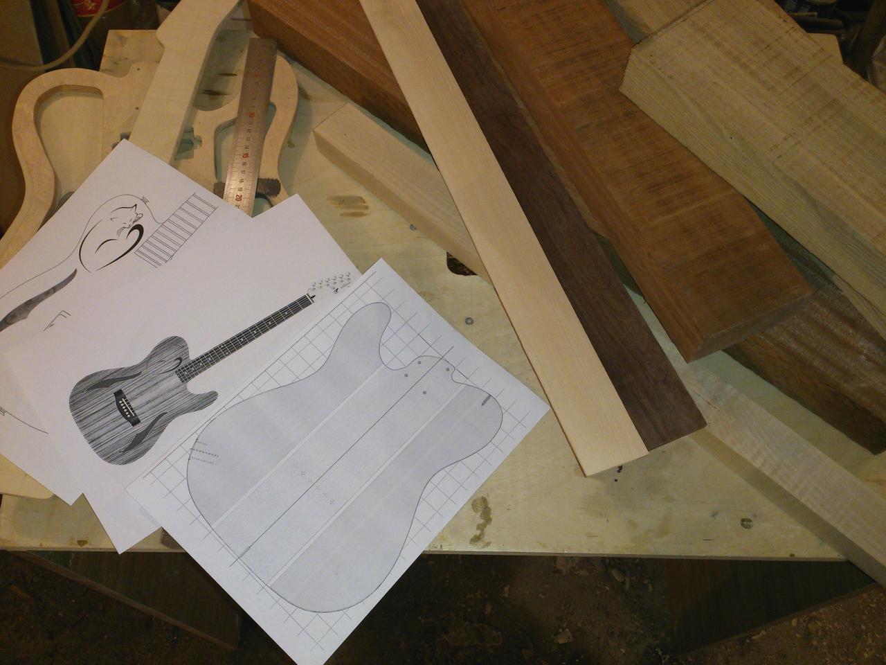 осенние кризисные дела исключили возможность какого-либо “эксклюзива”, поэтому порывшись по сусекам нашёл кой-какие материалы оставшиеся от прежних проектов. Вооружившись линейкой перемерял имеющиеся досочки, поприкидывал и так и этак… в итоге показалось оптимальным сделать переклеи грифа и дэки, в плане расходования материала и внешнего вида…