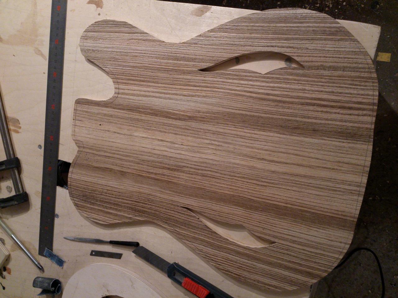 Дэка – переклей ясень-сапеле-ясень с 6-миллиметровыми вставками клёна (кстати тоже из купленной там же и не понравившейся фактурой накладки для баса). С топом из клёна, для некоторого “антуражу” сверху наклеил шпон зебрано,