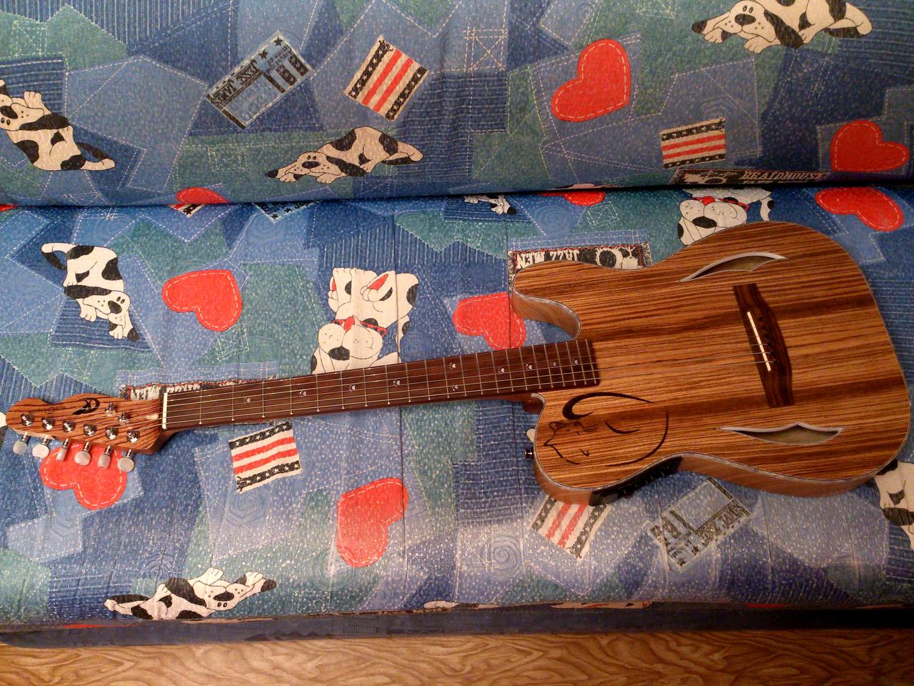 В прошлом году у друга был юбилей – 50 лет. В подарок Катя решила снять фильм, подняла на уши весь город, разыскала самостоятельно всех его друзей и записала на видео поздравления. Ну и как результат, после просмотра этого фильма у общественности возникло желание встретиться и «посидеть» как в старые добрые времена… С некоторыми мы не виделись уже лет 15-20, хоть и живём в одном городе… просто у каждого своя жизнь, у кого лучше, у кого похуже, у некоторых уже внуки, в общем забот хватает, изредка с кем-нибудь встретишься случайно, перебросишься парой фраз, обменяешься телефонами, ну и поздравления с Новым Годом и ДР (если ещё вспомнишь)… Ну рассказывать как происходила встреча я не буду, скажу только, что все были очень рады встрече, а после 2-3 стопок тормоза выключились, гитара пошла по кругу и создалось впечатление, что не было этих лет, что вокруг такие же пацаны и девчонки как и тридцать лет назад, когда мы все познакомились… (в общем если кратко, то мы – это два состава разных, как тогда говорили ВИА, нас случайно 34 года назад одновременно пригласили играть в одно место, где мы и познакомились…) ну вот, после такой тусовки и родилась у меня идея сделать приятное этой девочке… она весь вечер расспрашивала у меня про гитары, которые я делаю… но электро в обычном понимании ей не нужна, а акустик я не делаю… поэтому наткнувшись в инете на фотки телекустика решил попробовать сделать что-нибудь аналогичное…