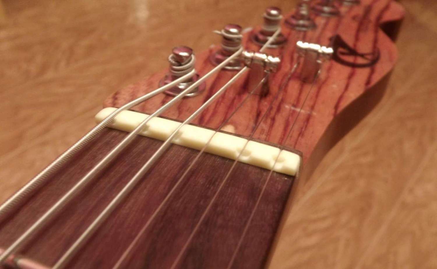 Потом начались неувязочки с покраской – шпон зебрано при шлифовке, несмотря на заявленную плотность самой древесины, оказался довольно рыхлым, волокна под шкуркой просто отслаивались… грунтовал 2 раза с промежуточной шлифовкой практически до дерева, потом лаком 3 раза, идеального результата всё равно достигнуть не удалось… но сил и терпения уже не оставалось, хотелось собрать и послушать что же получается… при сборке оказалось, что в основных размерах вроде как не ошибся, гриф сел как влитой, вклеенный бридж там где и должен быть, учитывая невозможность подстройки мензуры, очень переживал за этот момент (в первый раз всё таки делаю такое)… хлопотным делом оказалось подгонка высоты порожков, чтобы не ошибиться для начала сделал с запасом, потом за несколько приёмов постепенно стачивал, одновременно регулируя прогиб… ровнять лады не стал, вроде как установлены аккуратно и мешающего дребезга нет, после окончательной регулировки и подгонки полирну слегка для блеска и на этом наверно успокоюсь…