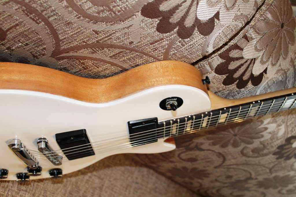 Решил я с ним поэкспериментировать. Зачистил гриф торцы и заднюю часть деки до дерева. А фасад деки до грунта. Фасад и перо грифа покрасил акриловой краской из балончика в два захода. Остальное покрывалось датским маслом в три слоя. Сохнет гад долго даже с ультрафиолетом. После этого еще месяц был легкий специфический запах. На звуке, как мне кажется, совсем не отразилось. Остальное на фото.