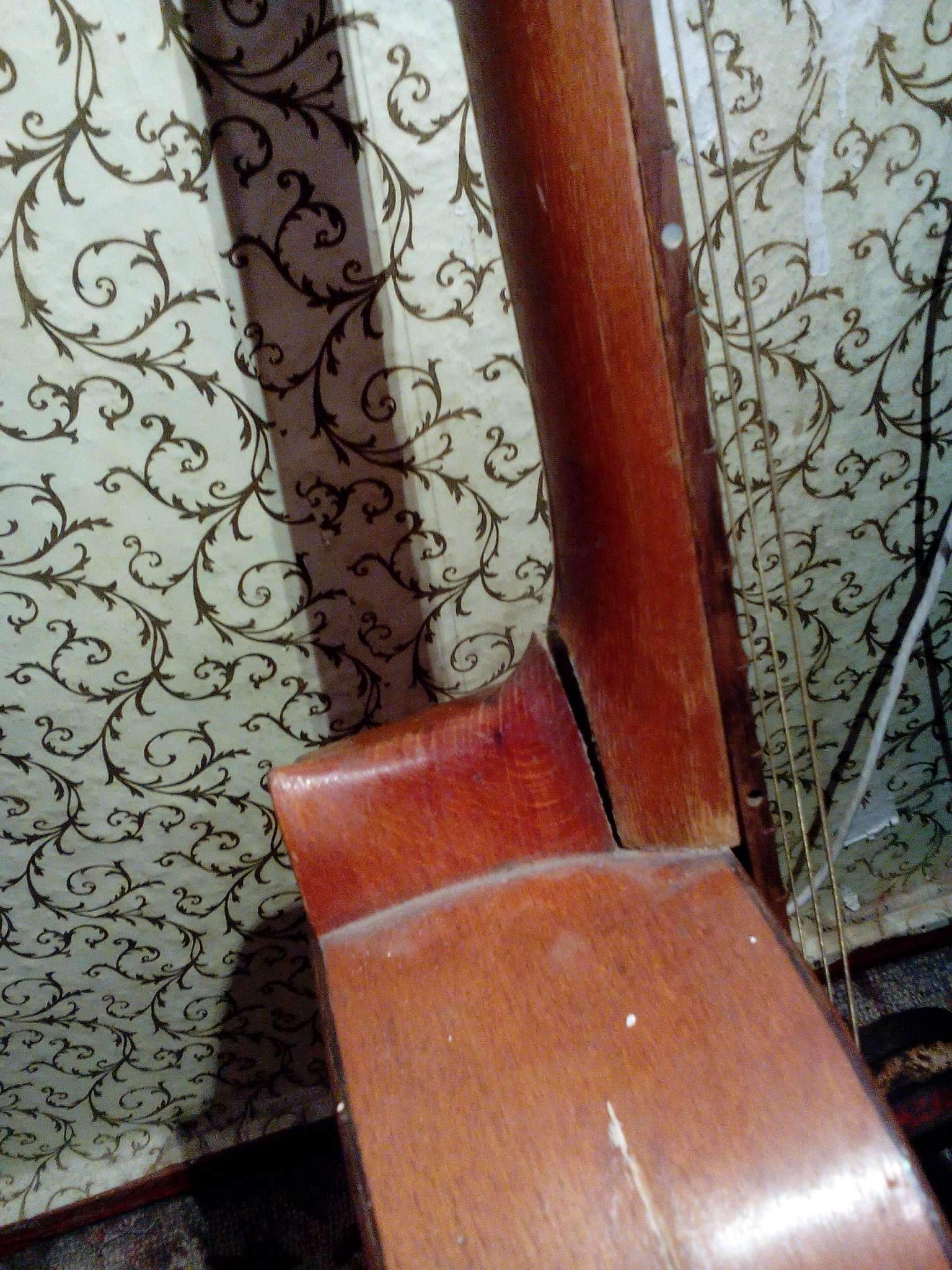 Это, похоже, старенькая классическа "Кремона", куда вместо нейлона натянули металлические струны. Гитара однозначно заслуживает восстановления, т.к. звук у неё вполне достойный. Самое правильное - аккуратно отклеить накладку грифа от деки и снять гриф, потом зачистить всё от старого клея и склеить снова. Попутно проверить всё и при необходимости подклеить, чтобы не было посторонних призвуков. Поставить нейлон и получать удовольствие.