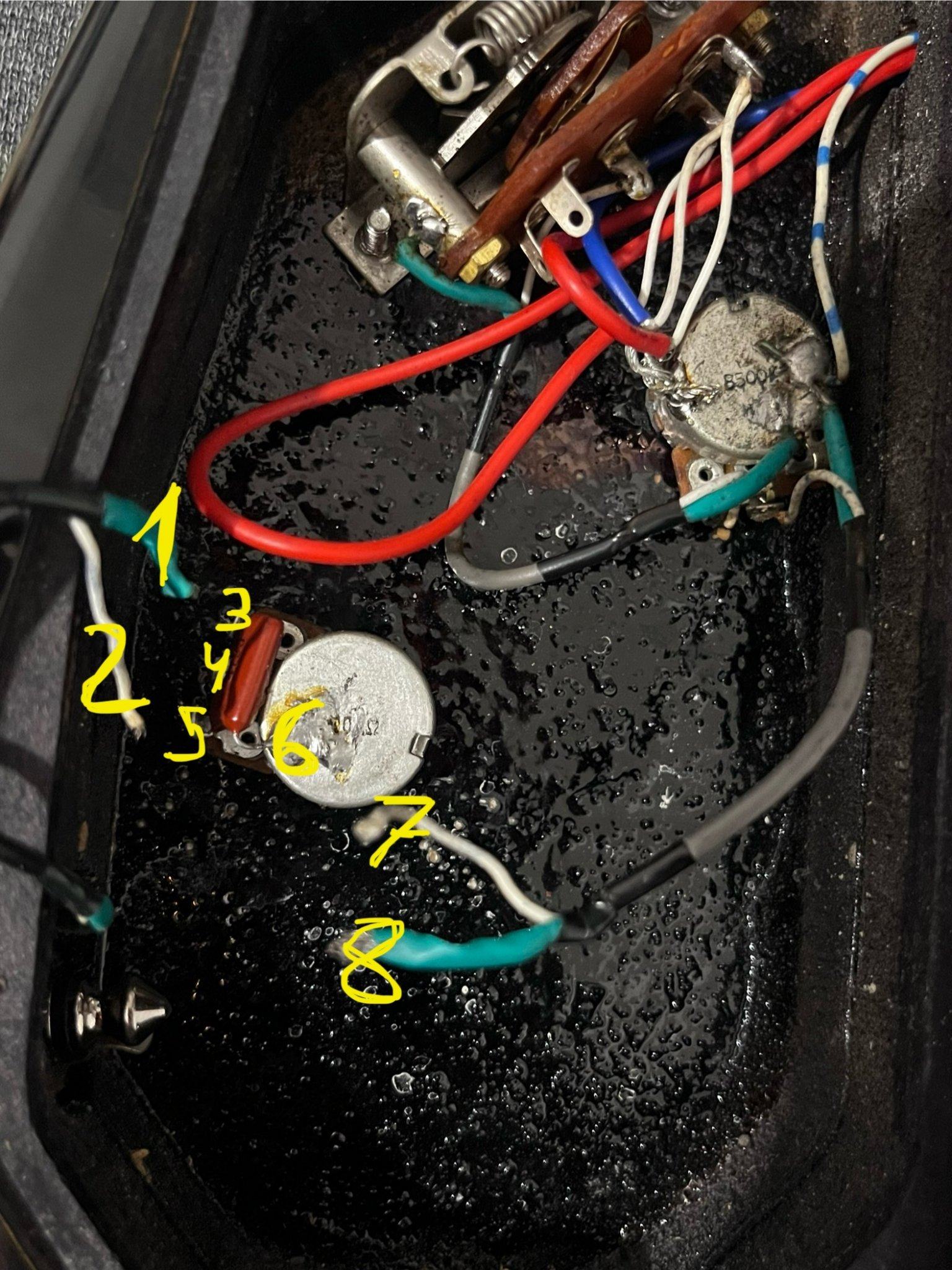 От старости и от долгой перевозки гитары, видимо, у ее и так ветхих проводов произошел отвал, так сказать. Прошу без упреков и доступно пояснить, какие куда паять, а то накосячить не хочу. Так бы давно сдал старуху дряхлую эту в мастерскую, много что надо латать, но таковых в моей области не наблюдается, а конкретно эта проблема насущна. Для удобства номерки подписал, благодарю☺