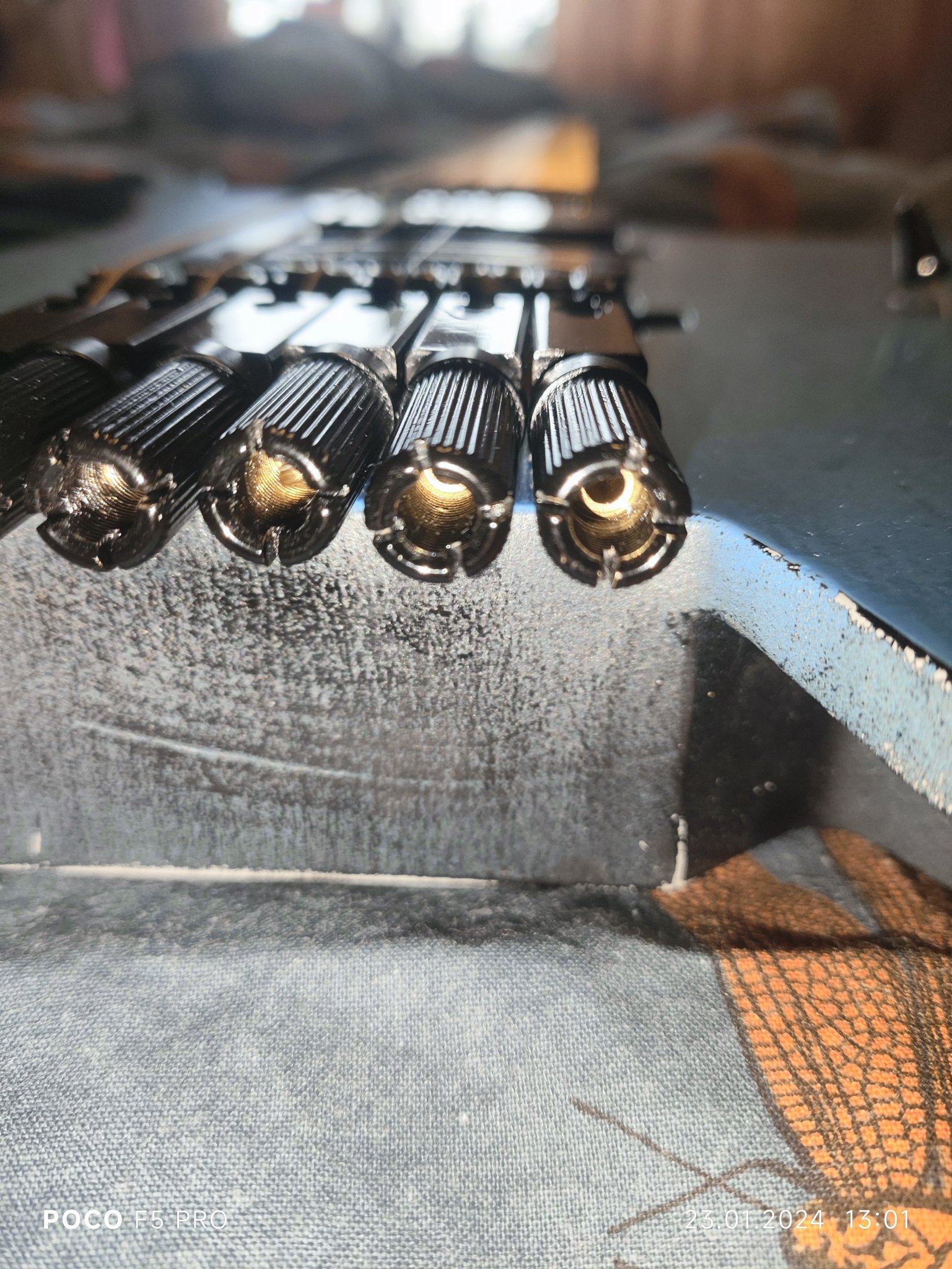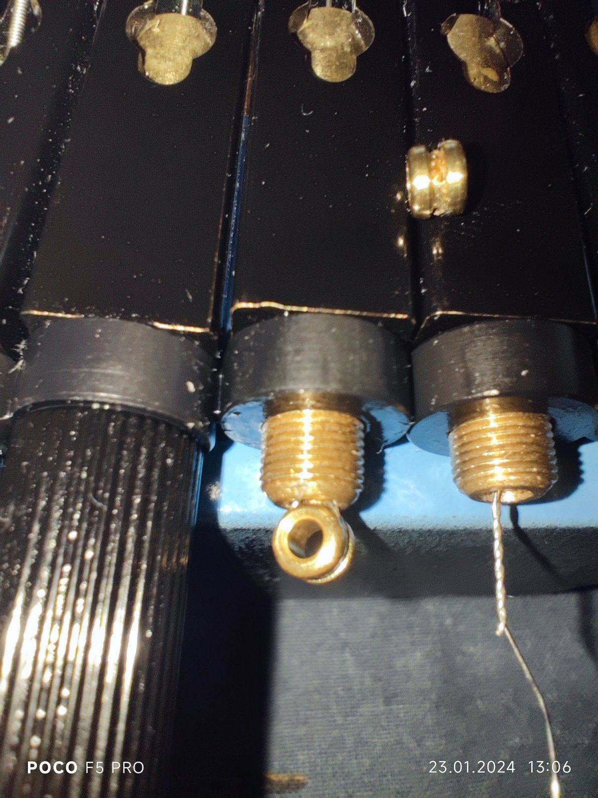 Я сделал так - при очередной замене струн, взял кружочек из верхей "гофрированной" части упаковки - тот, который получается, когда комплект в магазине вешают на металлическую направляющую - и в центре этого кружочка проделал тонкой иглой дырку. Продел струну в эту дырку, и теперь место контакта струны с металлом защищено. С тех пор ни одна струна ни разу не дрогнула.
