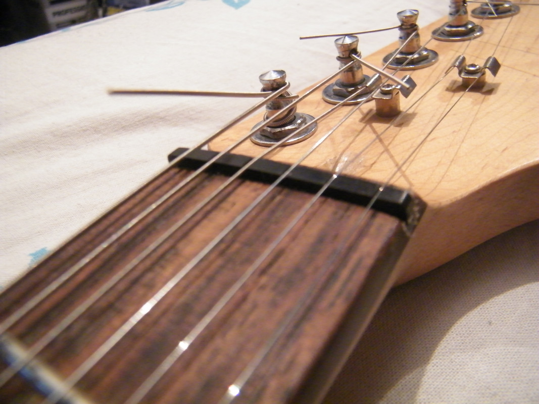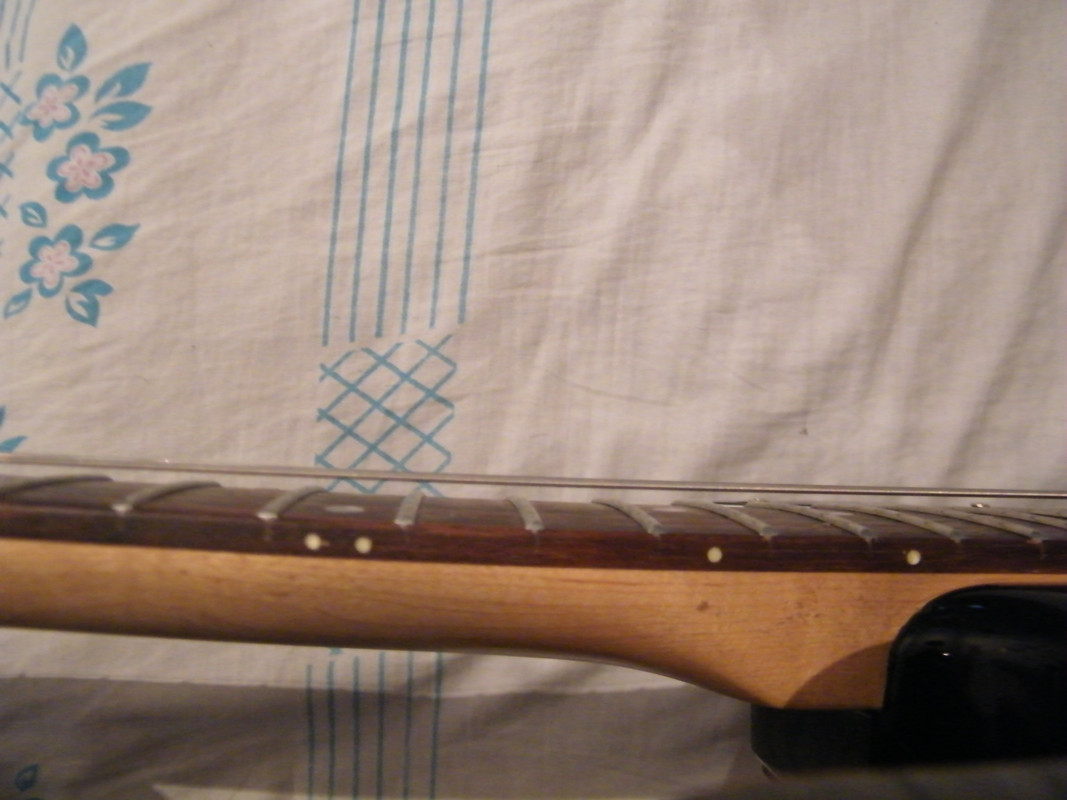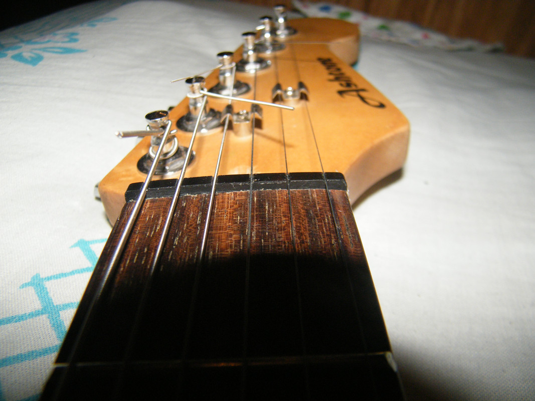 DmitryM, Но ведь если будет вровень с ладами то струна просто на них же и ляжет, поднимется немного за счёт изгиба грифа только и всё. Я делал так, ставил линейку в канавку и на лады, и смотрел чтобы над первым ладом был небольшой зазор и чтобы для всех струн был одинаковый примерно, и в итоге получил слишком низкий порожек, получается если бы поставил вровень, то было бы ещё ниже. Так же смотрел на других моих гитарах и там тоже не вровень, там зазор даже гораздо больше и даже над 2 ладом он есть.