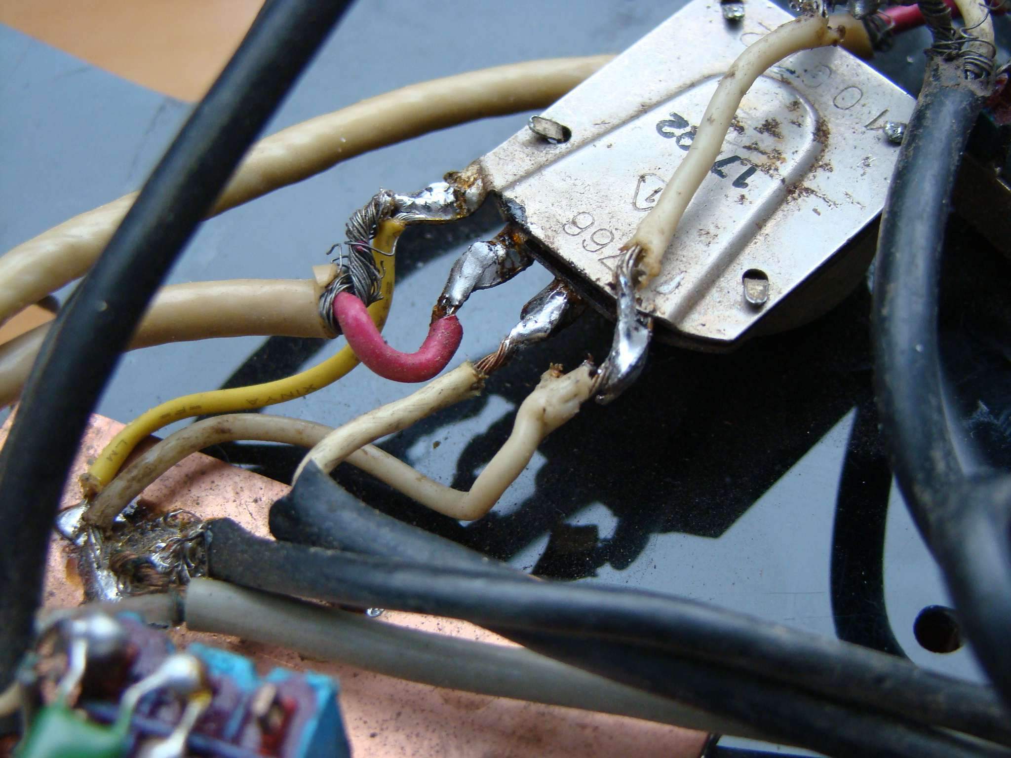 схема спаяна каким то видимо армянским мастером и вот она передо мной. причину поломки я нашёл быстро - при падении штоки потцев выдавили крышки , потцы развалились и голос пропал. я прихлобучил крышечки взад и вот он - звук, появился! казалось бы - что ещё надо для счастья? нет, хрен меня дёрнул - ну там же всё вообще не по человечески спаяно - никакой логики и вообще здравого смысла. я выпаиваю всю эту хрень вместе с проводами, ставлю новые, китайские потцы и спаиваю всё так, как оно хотя бы по правильному будет работать. средний датчик был выведен на отдельный тумблер, расположенный вверху гитары. чудовищная хрень - это не должно работать, но каким то магическим образом при включении этого тумблера звук пропадал и появлялся снова. ладно, всё привожу в божеский вид, и звоню клиенту. он приходит, садится играть. - брат, а где голос? ты что мне напаял? у меня когда одна крутилка вот сюда, а другая сюда, голос был, а теперь его нет. кручу его крутилки - вот говорю он, голос твой. а он - мне так не надо, я привык что вот так повернёшь и голос есть. снимаю лопух, показываю ему как всё спаяно - объясняю - нихрена не понимает. говорит верни голос. пробую по разному поподключать ему тумблерочки - нет, всё не то. тогда выпаиваю всю свою схему, и ставлю взад его родные потцы ( как хорошо, что я не догадался от них все провода отпаять, а то бы хрен я смог восстановить этот полёт мысли)