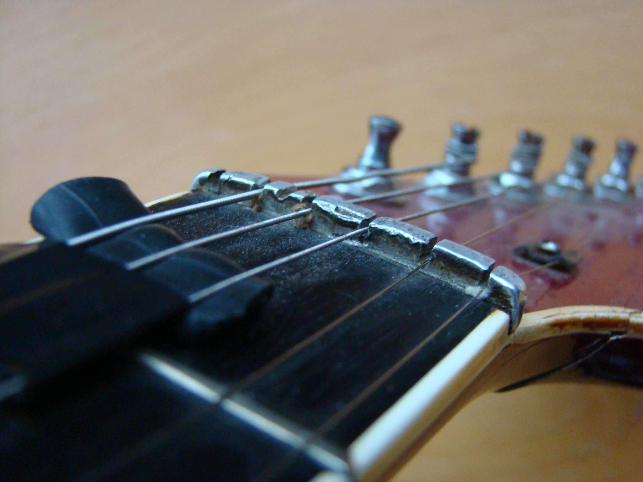 6 струны нет, а на 5 и 4 изолента приклеена. спрашиваю - зачем? - этот струна фон даёт. ну ладно, фон так фон. накладка вся изъедена пальцами, но только по 1 и 2 струне.