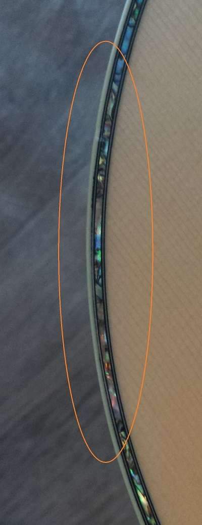 Добрый день. Уважаемые мастера прошу вашей помощи. Гитара crafter ml rose. С гитарой начали происходить странные вещи. Изменение структуры лака. На деке появились углубления и маленькие трещинки. После изучения материалов в интернете первым делом купил гигрометр, обычный советский. Влажность действительно оказалась 20%. Перенёс гитару к родителям там 45-55%. Через два дня все маленькие трещинки и впадинки на лаке исчезли, но появилась новая напасть. В местах украшений поплыл рисунок окантовки. На рисунках отмечено красными линиями? Прошу вас подтвердить, это выступает клей? Я начал надавливать пальцем в этих местах и рисунок частично вернулся, мутный, но вернулся. Уважаемые мастера подскажите пожалуйста, что с моей гитарой и как можно вернуть рисунок окантовки. Заранее большое спасибо. Прошу извинить за сумбурный текст, очень взволнован.
