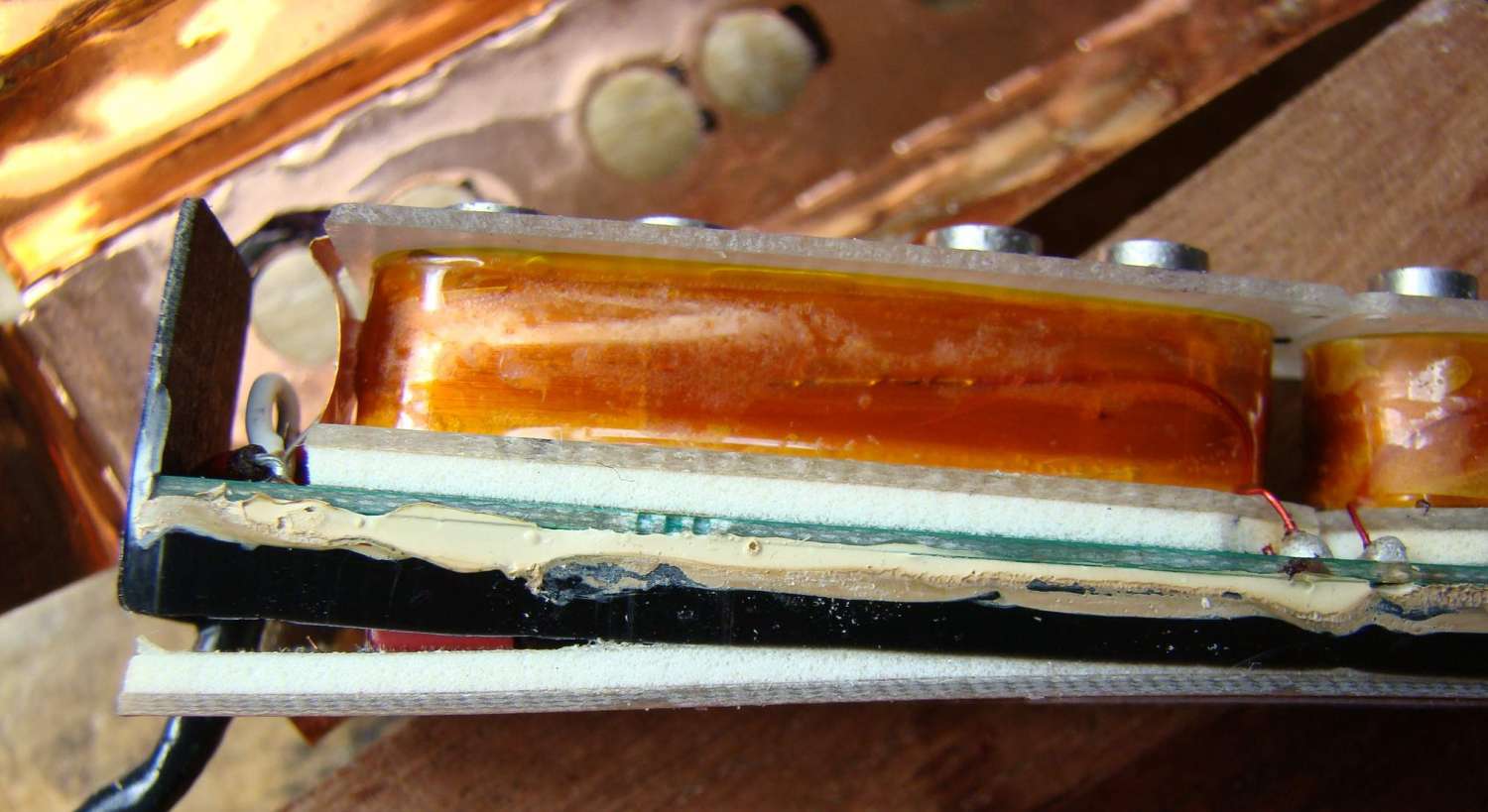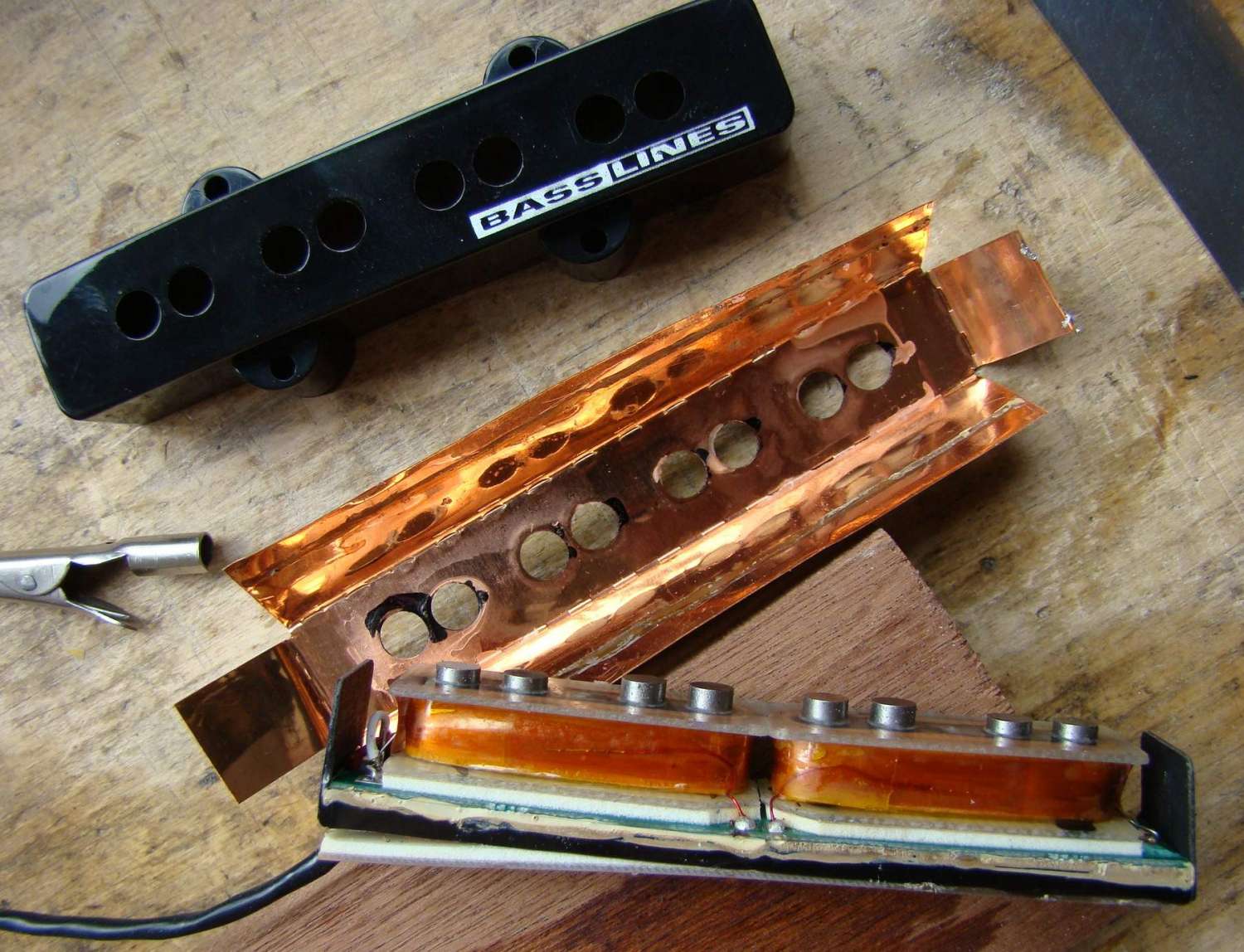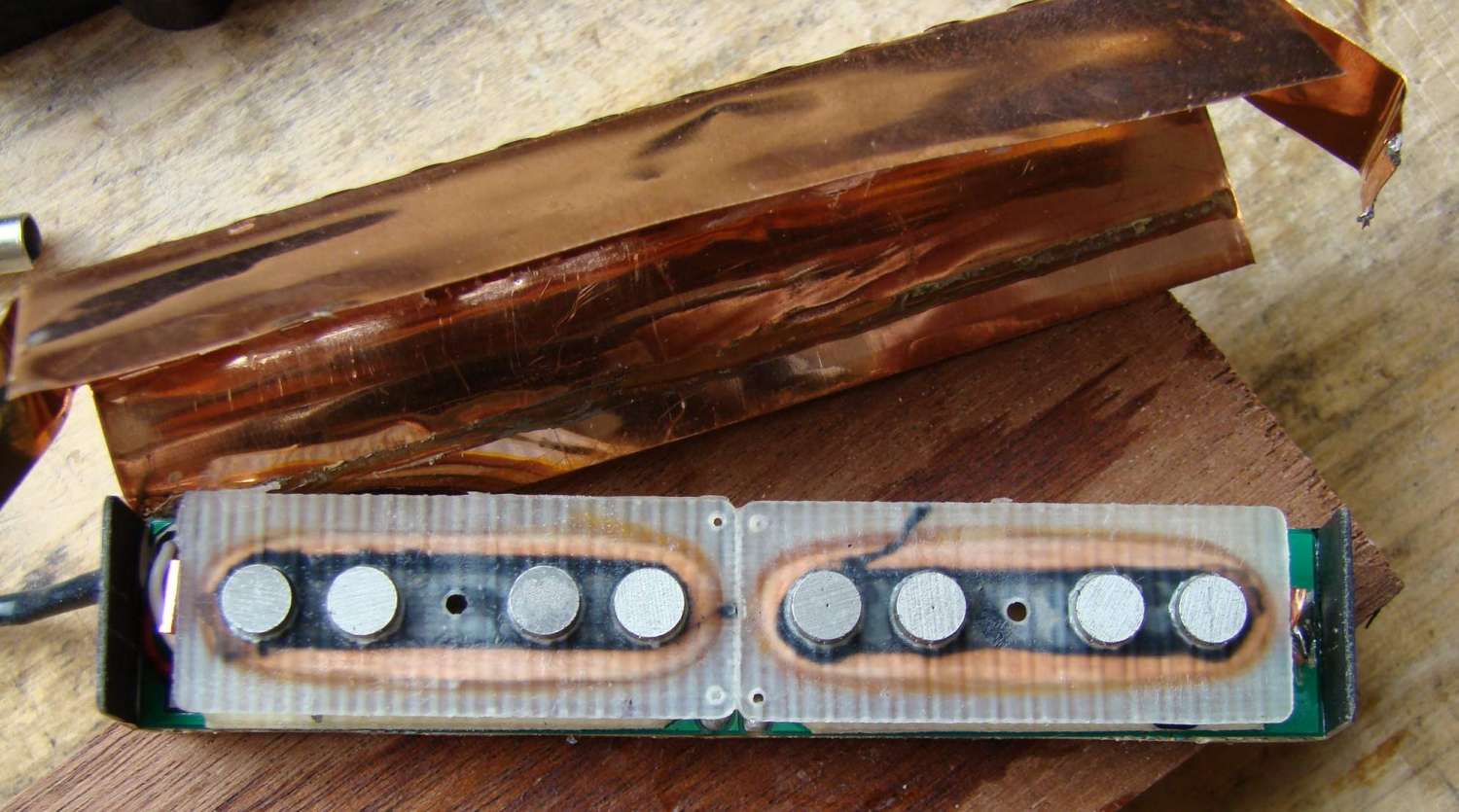 конструкция его такова - на плату приклеиваются 2 катушки, с обратной стороны платы преамп. в крышечку вкладывается экран из медной фольги, потом туда опускается звукосниматель в сборе, и всё это заливается какой то мастикой. поскольку плата вырезана впритык, мастика внутрь звукоснимателя не проникает, и приклеивается к фольге только по периметру. в общем с нагревом всё это очень легко разъединяется. всё что я там увидел представлено на фото. проблема оказалась в том, что у больной катушки была действительно холодная пайка. сперва она не прозванивалась тестером, а потом я щупом потыкал, она и ожила. ну я естественно все пайки на катушках пропаял для пущей важности. преамп вскрывать не стал - пусть живёт.