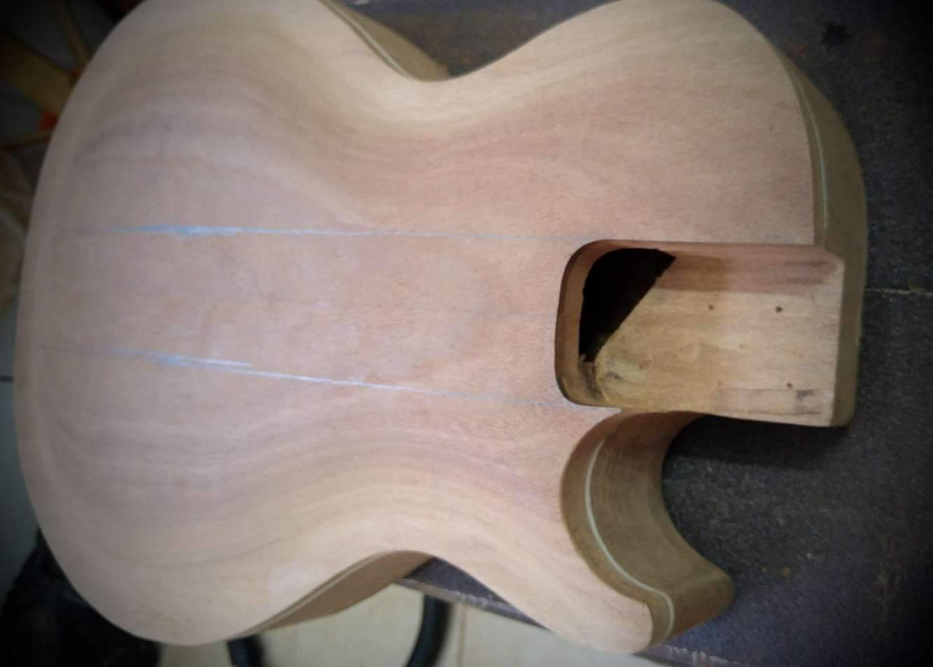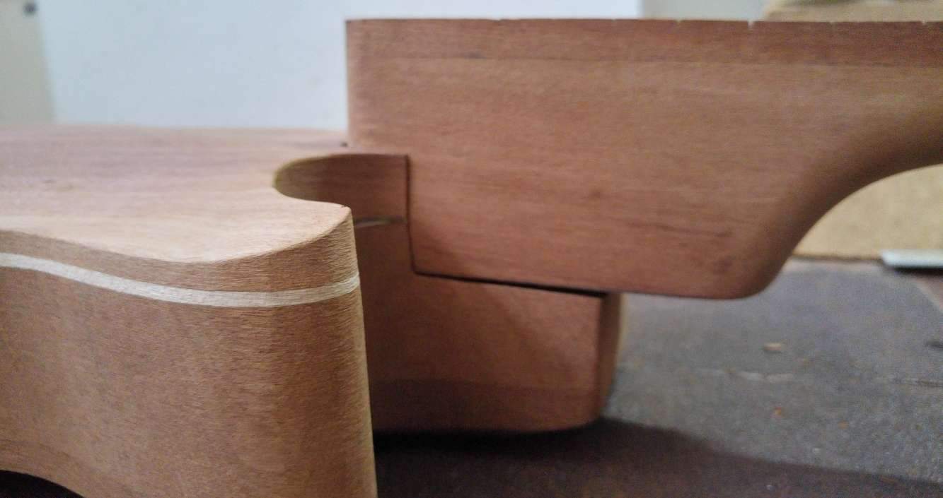 Возможно, я не вполне проникся грандиозностью замысла, но простое и очевидное решение - срезать часть монструозной пятки грифа по высоте. Благо, дерева там по толщине с бо-о-о-ольшим запасом...
