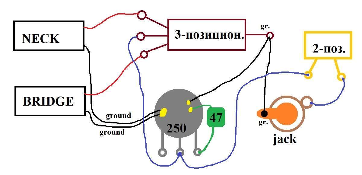 - трехпозиционный переключатель (для отдельного включения нека/бриджа),