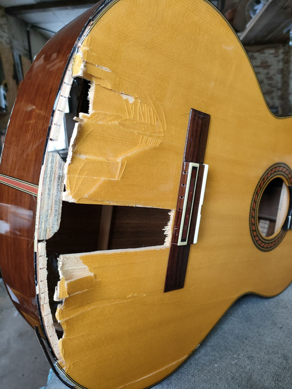 После того как я сделал свою первую гитару BN-1, я решил показать ее на форуме guitarplayer.ru. Отклики были в основном доброжелательные, но к сожалению я не смог показать ее на другом ресурсе, где собираются в основном мастера по изготовлению классических и акустических гитар - на MasterGuitar. Форум не доступен для общения по политическим соображениям. Хотя все, что было накоплено в нем, вполне доступно для прочтения. Через несколько дней мне ответил человек, который захотел купить мою гитару. Оказалось, что он большой почитатель творчества Ричи Блэкмора и мало того, он живет совсем недалеко от меня - буквально в десятке километров. Мы созвонились и он приехал ко мне, чтобы посмотреть инструмент. Мы разговаривали, а в моей мастерской звучал незабвенный "Minstrel Hall", только уже в исполнении моего гостя. Покупку-продажу моей BN-1 мы пока отложили, но он рассказал мне о весьма трагическом случае, который произошел с его гитарой - Ямахой 151с. Она нечаянно упала с какой-то совсем небольшой высоты и у нее совсем немного отошла верхняя дека. И он попросил меня ее отремонтировать. Я согласился и мы поехали к нему смотреть инструмент. То, что увидел я, вы можете увидеть на фото выше. Да, поломка была вполне заурядная, я бы сказал даже косметическая. Немного треснула и отошла от клеца верхняя дека, чуть треснула обечайка, а в основном все цело. Ну вы поняли уже, что я шучу. Я сказал моему новому другу, что пациент скорее мертв, чем жив. И этот пациент уже нуждается не в лечении, а во вскрытии. Максимум, что можно сделать - это взять у него несколько здоровых органов для будущей пересадки. Этими целыми органами оказались бридж и гриф. Нижняя дека тоже была разрушена в нижней части с поперечным разломом. Мне кажется, что гитара упала все же не откуда-нибудь с полки или стены, а как минимум с самолета. Мы решили, что гитару надо делать полностью новую. Теперь не знаю, куда мне отнести данную работу - к ремонту или к изготовлению нового инструмента. Все же решил, что это будет изготовление нового. В том числе и потому, что мой заказчик хочет чтобы гитара была с катавеем как у его любимого в прошлом "Эпифона".