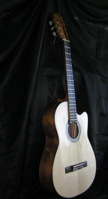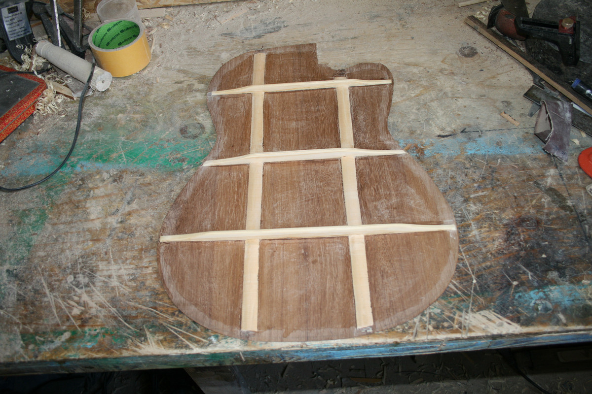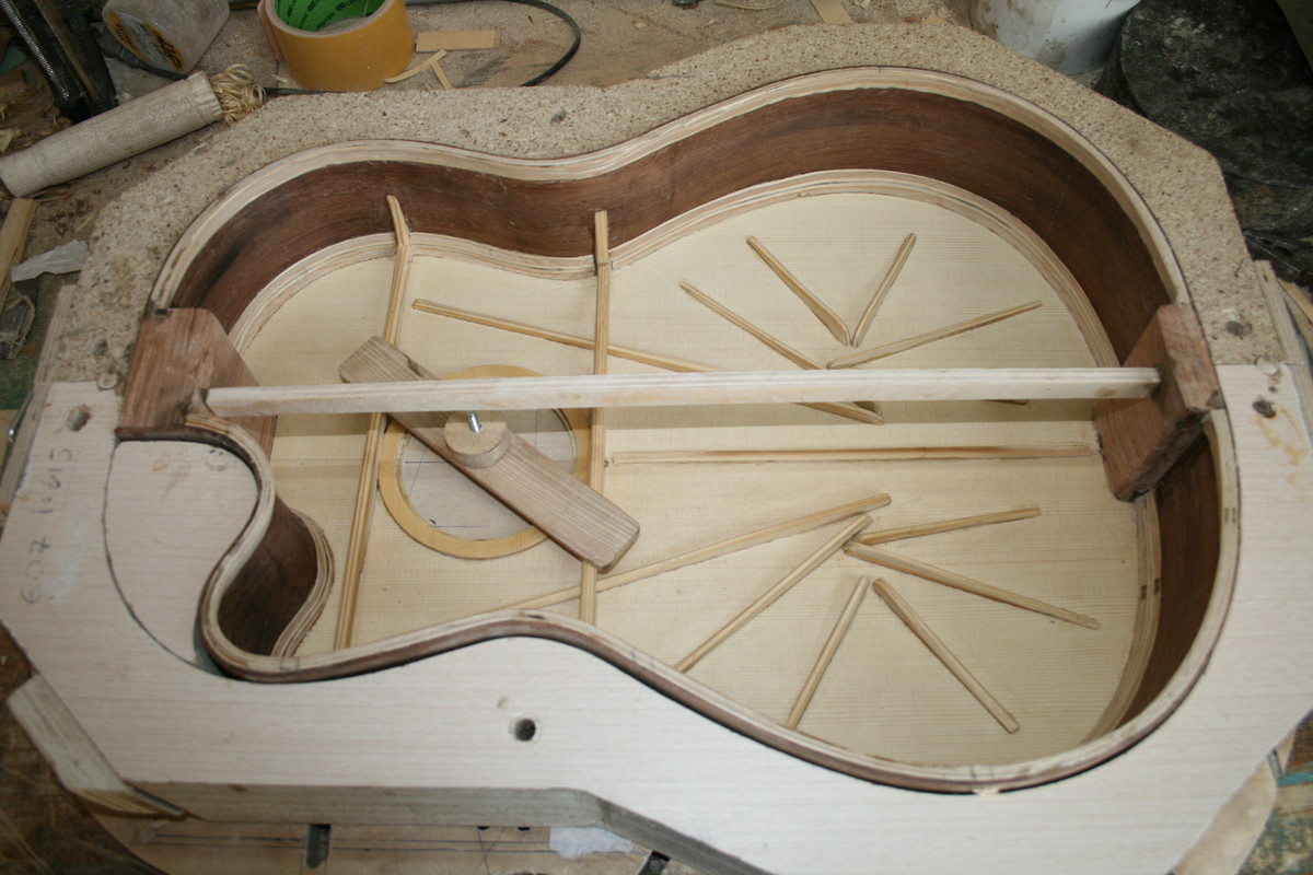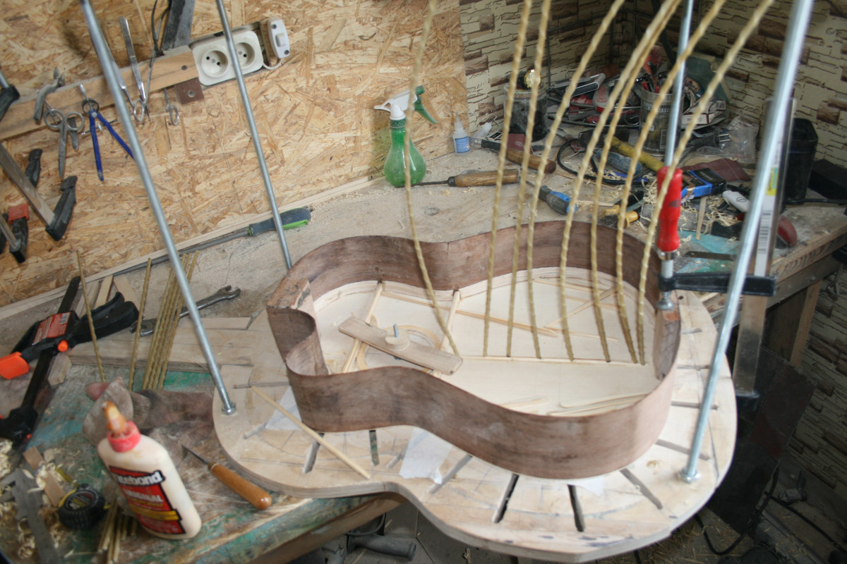 Да, я приклеил бридж сразу. Согласен, это не совсем традиционный путь. Но для такого решения были причины. Я, конечно, не сам это придумал. Где-то прочитал, что с заранее приклееном бридже удобнее отстраивать деку. Можно до лакировки послушать гитару и сделать необходимые доработки с пружинами и с толщиной деки. А в солере я сделал вырез под бридж и никаких неудобств в дальнейшем не возникло.