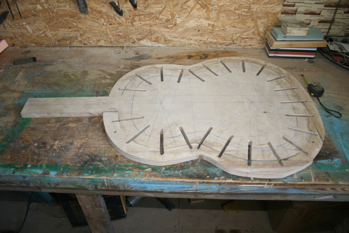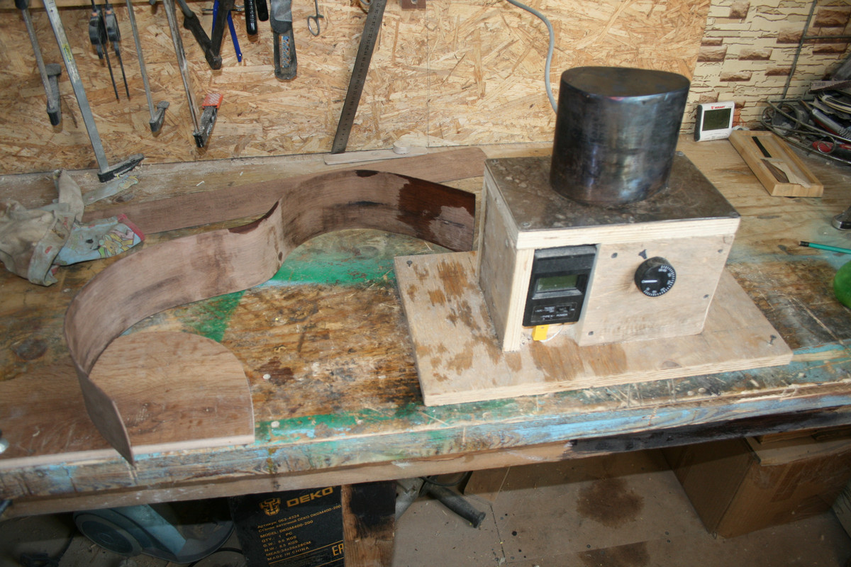 Контробечайки решил делать цельными. То есть без пропилов, как это делают обычно другие мастера. Не уверен, что все, но большинство. Делают их с пропилами и на фабриках. На Алишке тоже продаются контробечайки с пропилами. Спрашивается, а зачем? Только для удобства и убыстрения процесса. На мой взгляд очевидно, что эти пропилы даже ведут к ухудшению и ослаблению звука. Поэтому я решил сделать цельными. Возможно я выбрал не самый подходящий материал, но гнуть цельное дерево которое в сечении составляет 15-20х4-5 мм. совершенно невозможно. Особенно в районе катавея. Решением стала 6мм фанера (точнее 2 слоя 3-х мм.). Чуть намочил и гнется идеально. Также считаю, что и жесткость всей конструкции с цельными контробечайками будет значительно выше.