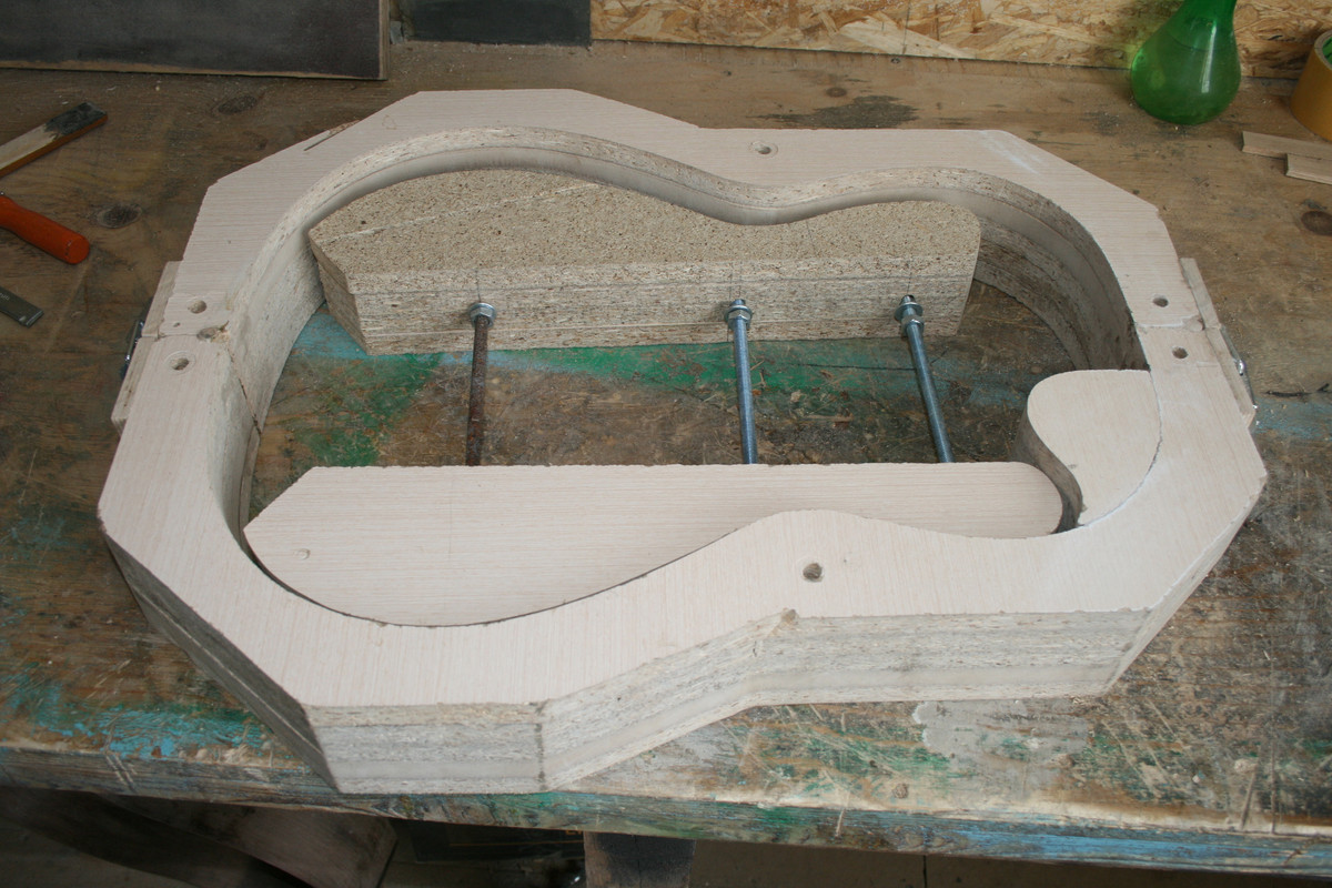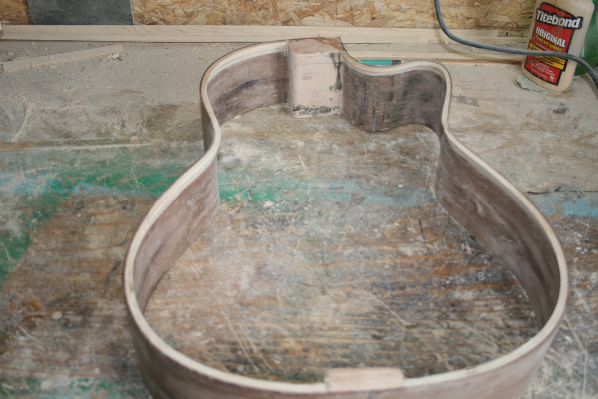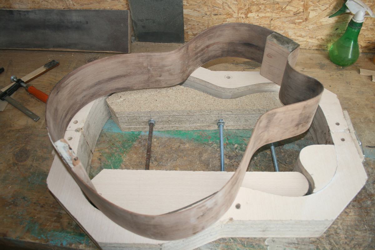 Так что пришлось делать вайму. В результате получились обечайки, которые я склеил на клецах. Клецы сделал из кусочков миранти. При изгибании нижней обечайки, это которая с катавеем, испытывал страх, что в месте самого крутого изгиба заготовка треснет. Но мадагаскарский палисандр показал хорошую податливость при изгибании. Чего не скажешь о пламенном клене, который я гнул для своей первой гитары BN-1. В месте самого острого изгиба он немного треснул. Я конечно подклеил скол, так что выбрасывать заготовку не пришлось.