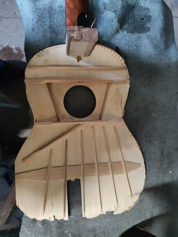 Вскрытие показало, что верхняя дека сделана из массива ели с хорошим радиальным распилом. Толщина составляет 3,8 мм, из которых на лак приходится около 0,8 мм. Хороший, крепкий и надежный слой лака. Однако это не помешало при ударе разлететься деке в дребезги. Толщина древесины одинаковая по всей площади.