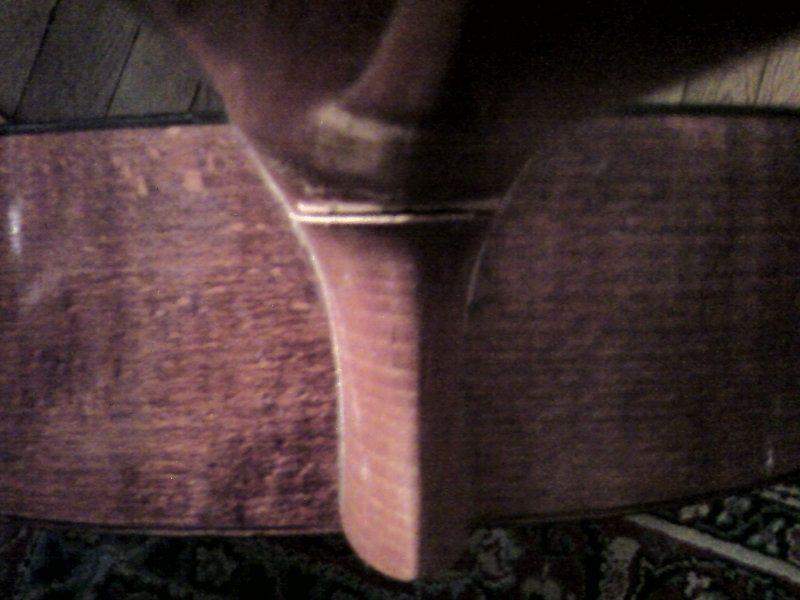 У меня тоже такая в работе. Правда у прежних хозяев гриф не обломился а просто отвалился. В оригинале гриф (накладка точнее) был приклеен к деке (лежал на ней всей плоскостью) столярным клеем. Естественно, после этого народ посадил гриф на что то типа эпоксидки - в результате образовалась щель между грифом и декой - как у ТС.