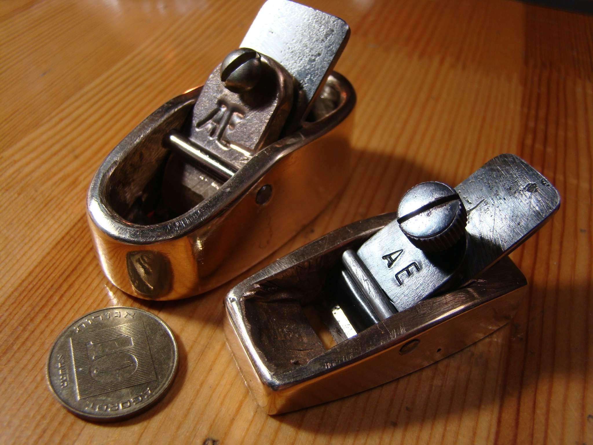 Далее, на фото на боковинках ножа видны снятые под углом 45 градусов фаски, по которым нож прижимается винтами. На шляпках винтов, снизу шляпки, тоже сняты фаски под 45. Таким образом, фаска ножа прилегает к фаске винта, в то же время, позволяя ножу перемещаться вперед- назад. Вперед нож подается шпильками, которые тоже видны на фото (кончики торчат слева). Две шпильки сделаны, чтобы точно устанавливать вылет ножа на каждой стороне.