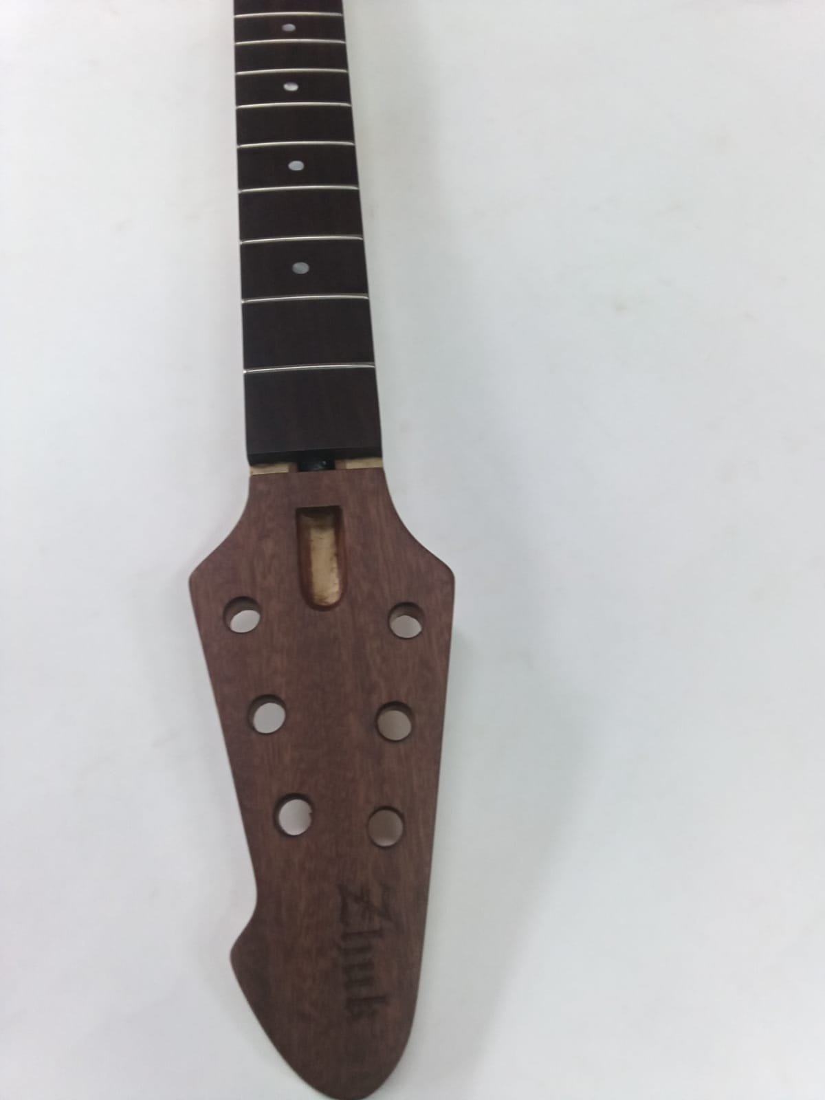 И так, начнем с грифа. Традиционно по конструкции- переклей клена и махагона с цельной головой под 12 градусов. Накладка на головке- махагон. Накладка -палисандр, 20 ладов,профиль 12",ширина у верхнего порожка-43 мм. Гриф профиля "С",на первом ладу -23,5 мм, на двенадцатом -25 мм. Лады -Sintoms 2,8 мм особотвердые.