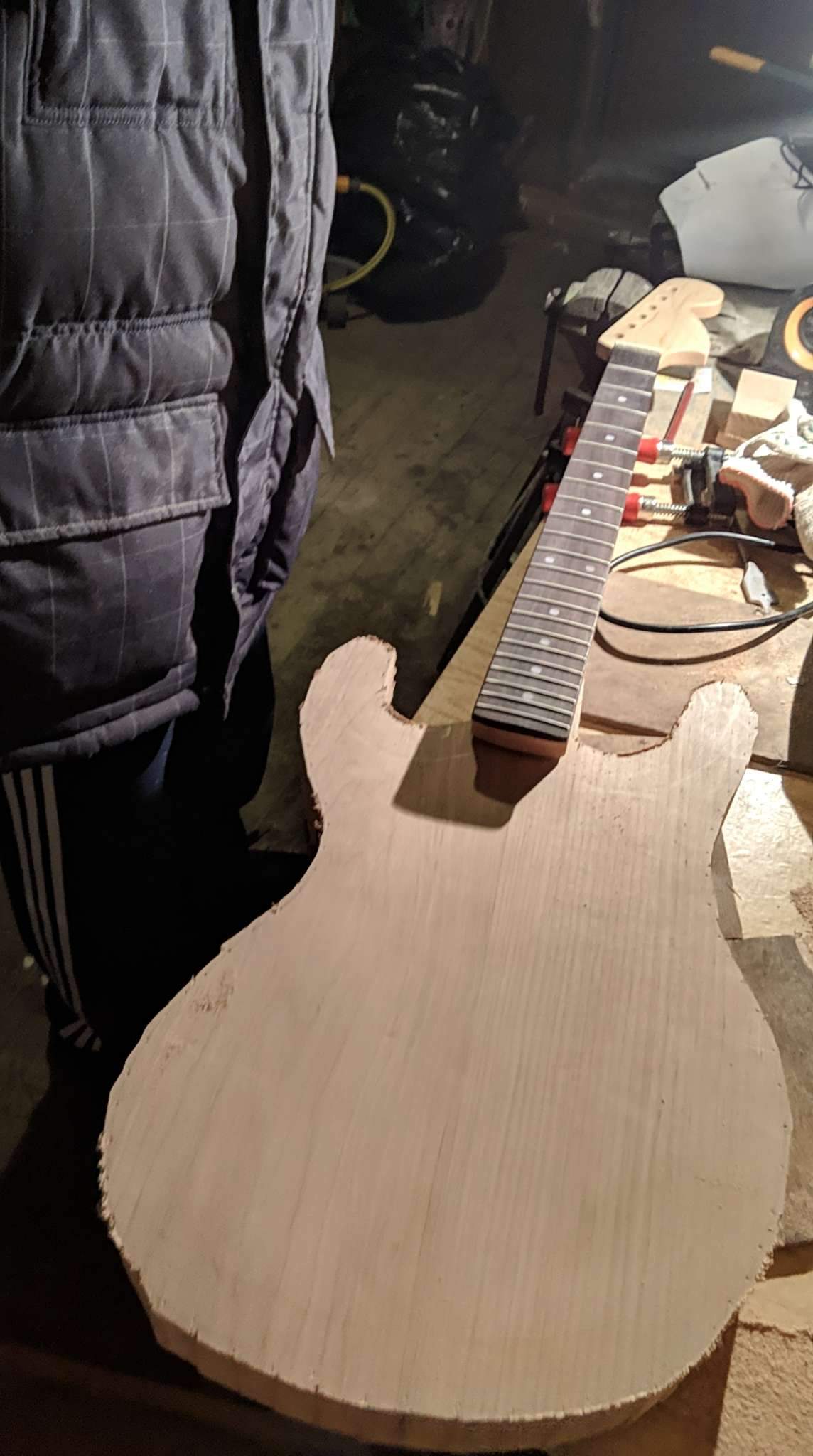 Здарова всем. Выпилил наконец-то корпус, было тяжеловато, но включил нирвану, ньюстед и понеслось. Сейчас заровнял лицевую и обратную сторону, несмотря на пару косяков, которые я допустил при работе с лобзиком, он местами продавливал дерево металлической подставкой, на которую еще ставится лобзик при пропиливании.