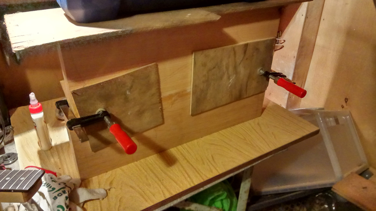 По бокам струбцины и сверху придавил 7-ми килограммовым ящиком. Прижал именно так, потому что не было длинных струбцин.