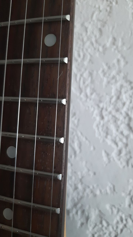 modus2000, на производстве, в мастерских (и уверен на Томанне при отстройке) юзают такой инструмент - деревянный брусок с напильником под углом в него вбитым... этим бруском готовый гриф обрабатывают с двух сторон, спиливая вылезающие лады (вместе с кромкой накладки). Посмотрите на свою накладку - она в точке перехода поверхности накладки в обратную сторону грифа не острая, а сточена 1-2 мм под углом...