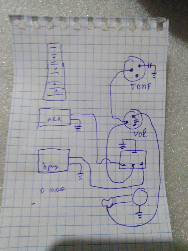 Подскажите, пожалуйста, правильную электросхему со следующими компонентами: 2 звукоснимателя; 2 потенциометра; 3-х позиционный переключатель; конденсаторы.