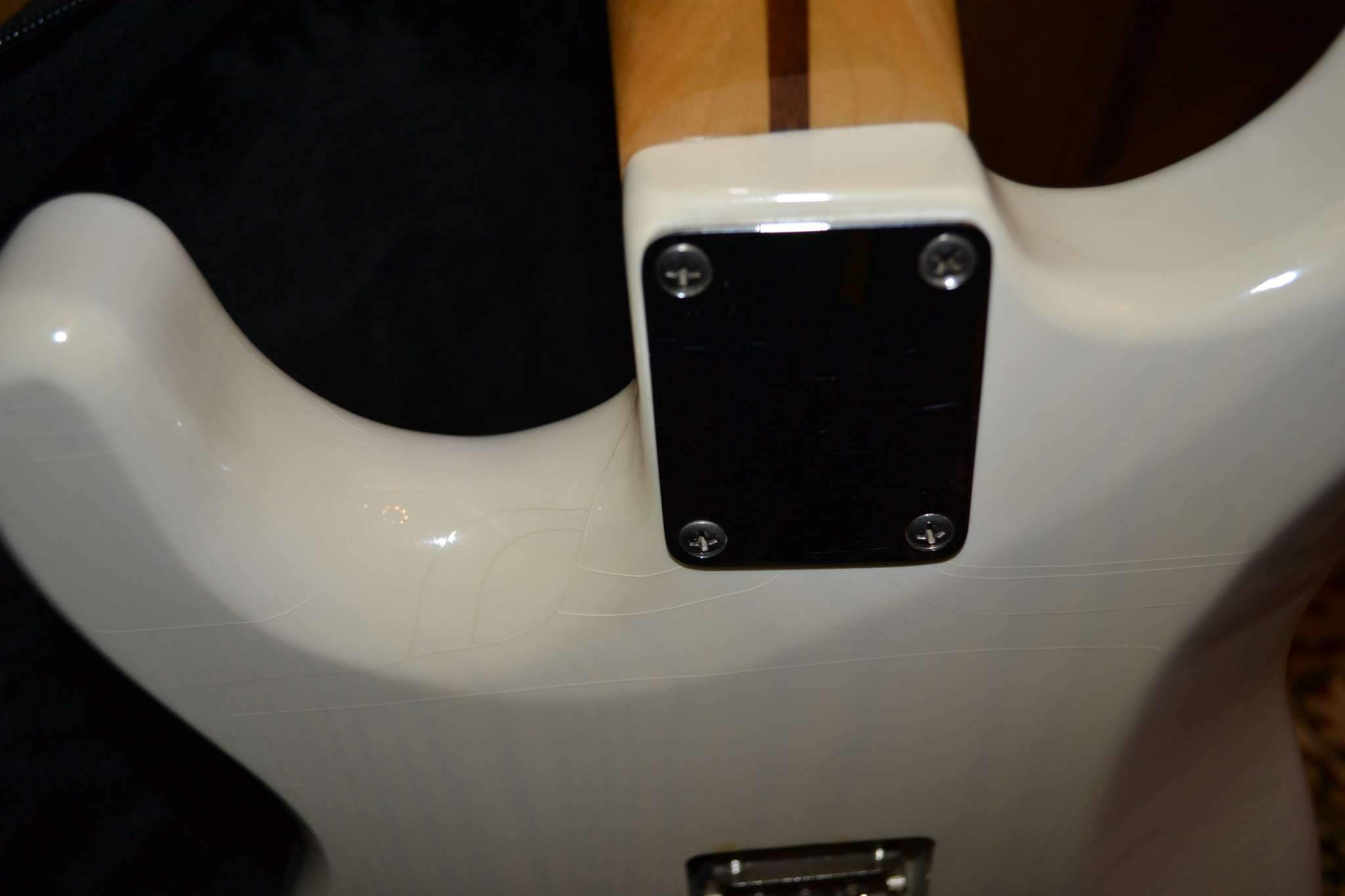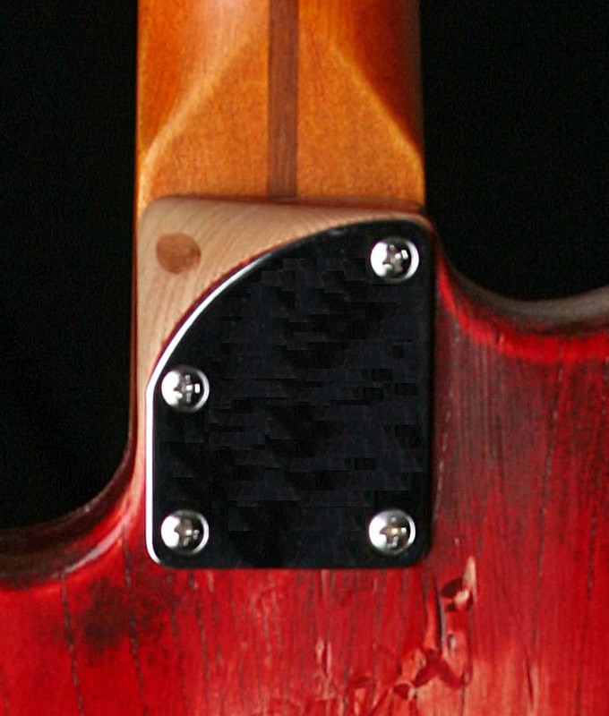 Если хочется сохранить нек плэйт и стандартную сверловку, то можно сточить под углом, как делает Warmoth - будет не так удобно, как в предложенном ранее варианте, но лучше чем без него и два шурупа придётся укорачивать (или подобрать готовые, которые короче).