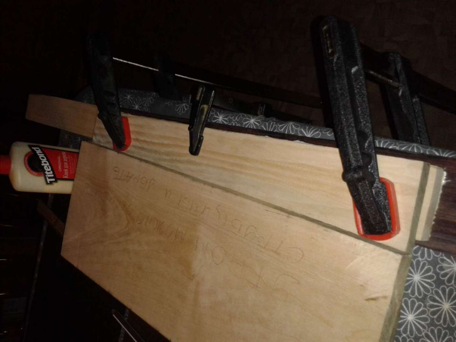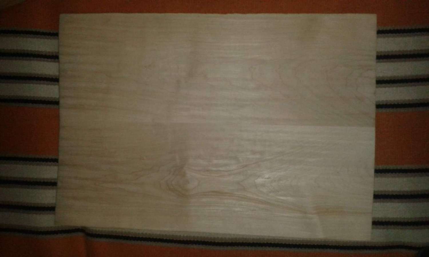 - Топ кленовый обработан и склеен. Прошелся по плоскостям фрезером. Теперь его толщина 5 мм. Долго и нудно по паре мм его стачивал - ужасно нудное занятие. Поймал все грабли наверное так как до этого заготовки такой толщины не склеивал. В итоге удалось его склеить при помощи ровной плиты, двух струбцин прижимающих половинки к плите через бруски (чтоб не сложился) и трёх струбцин стягивающих заготовки.