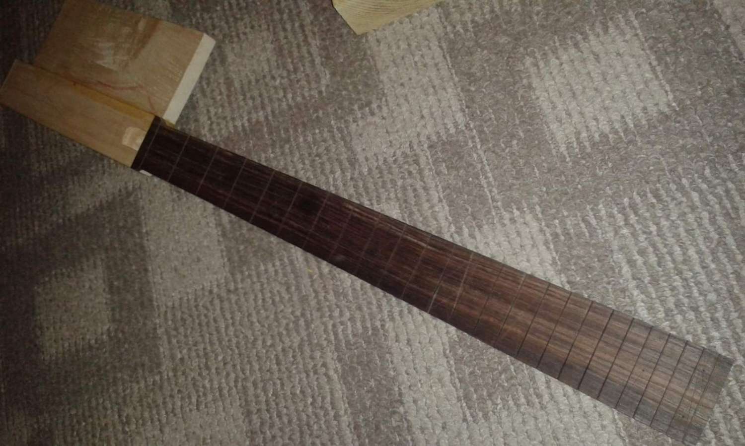 - К грифу тренировочному приклеены уши. Приклеена накладка. Пропилы под лады сделал.