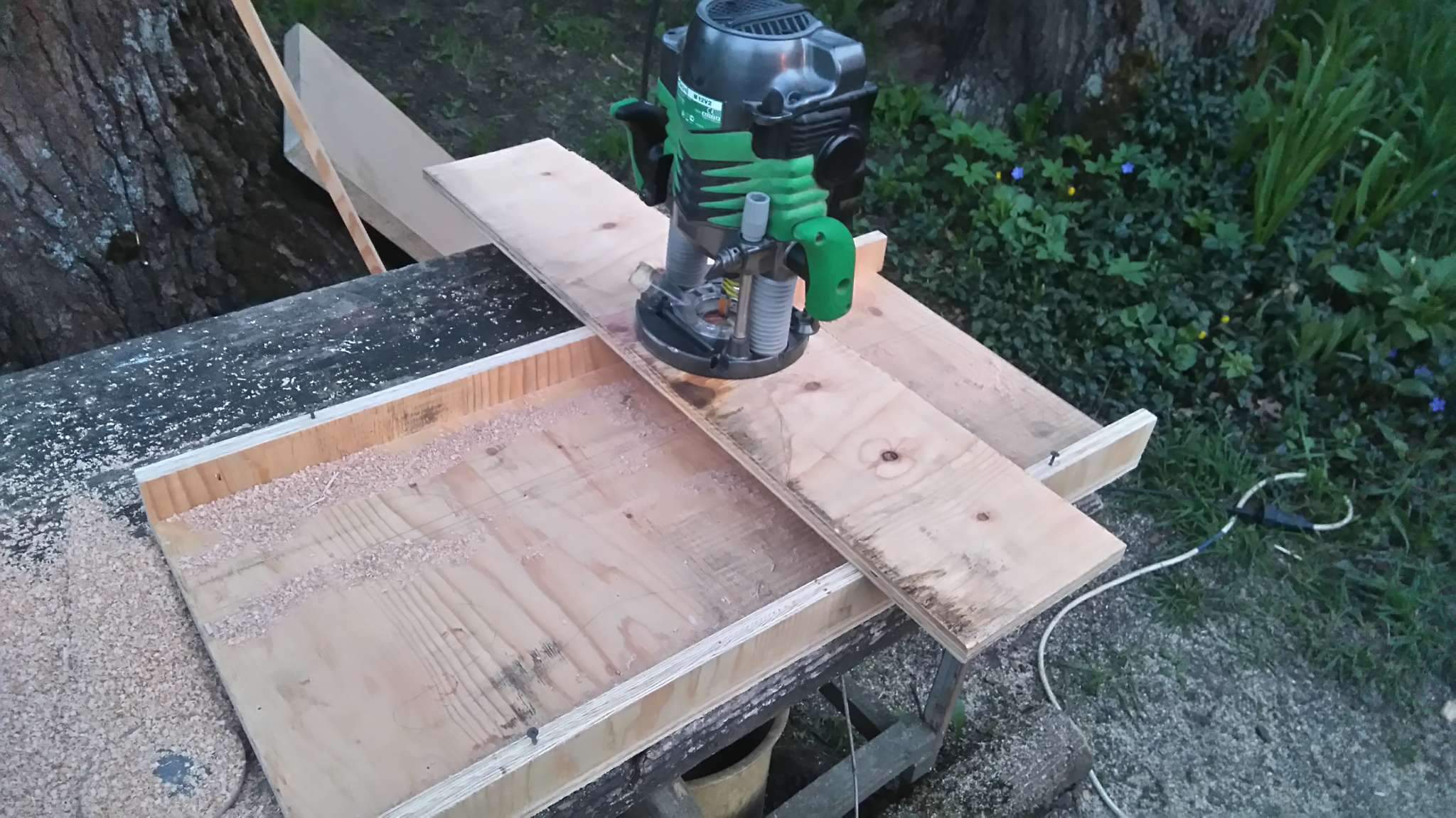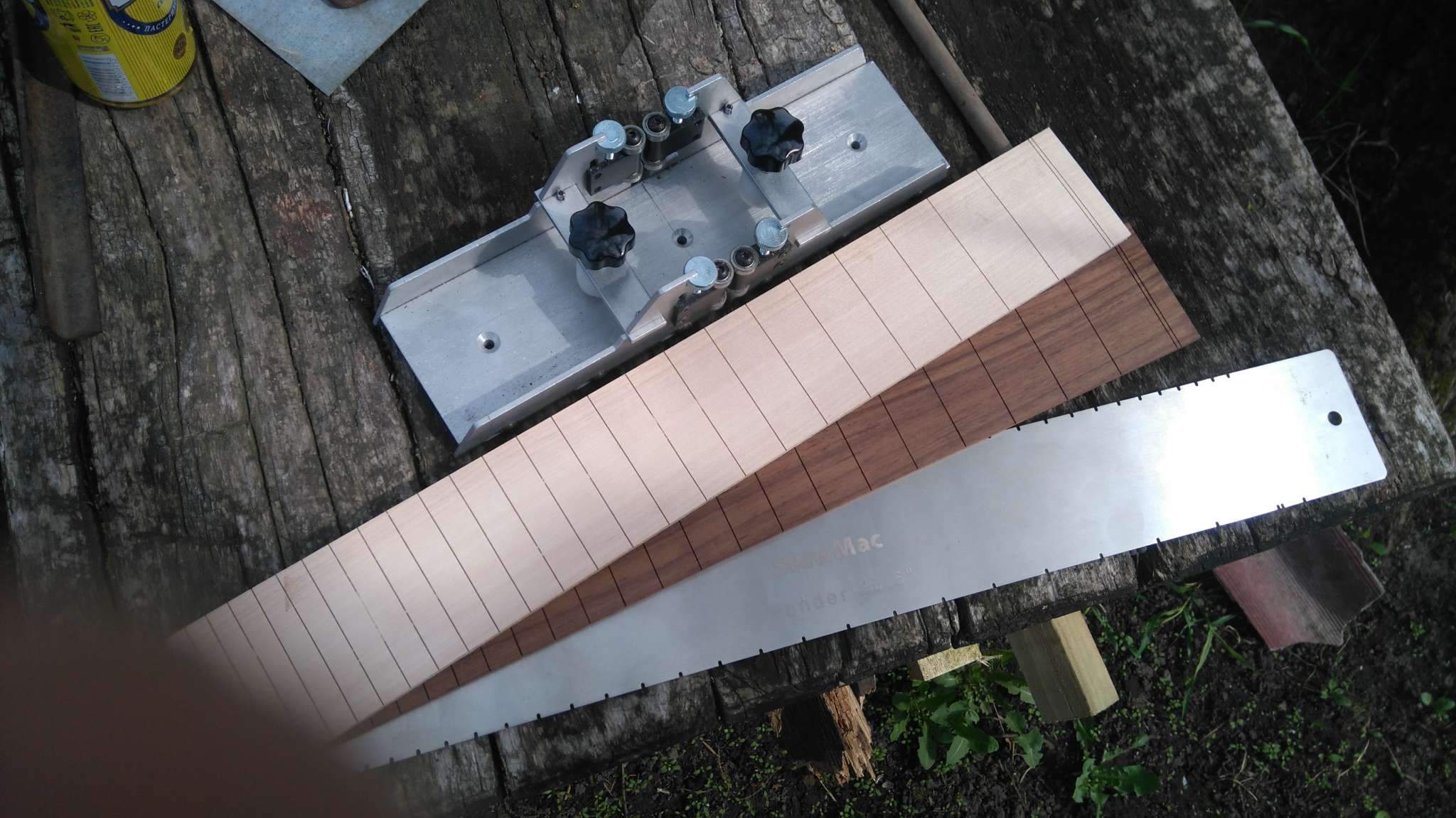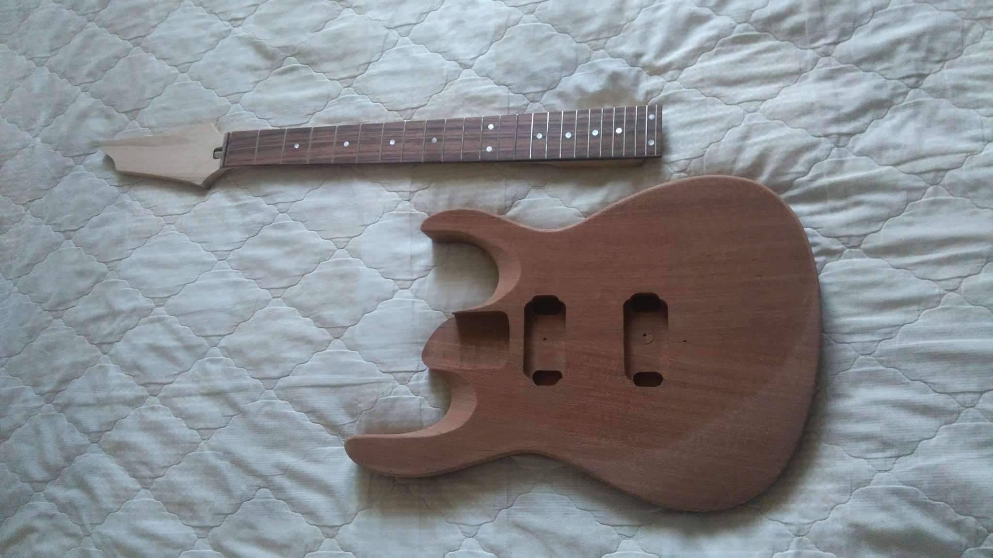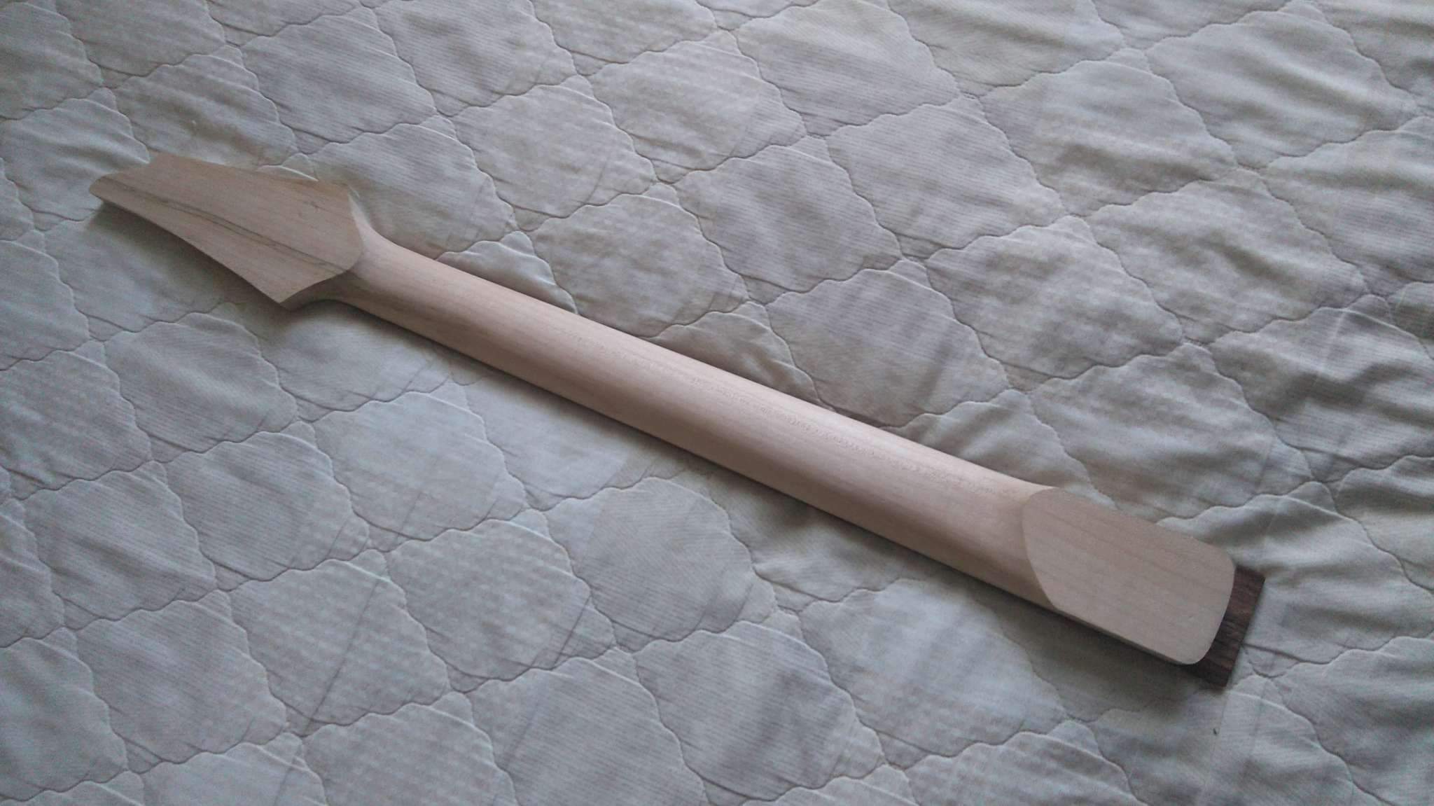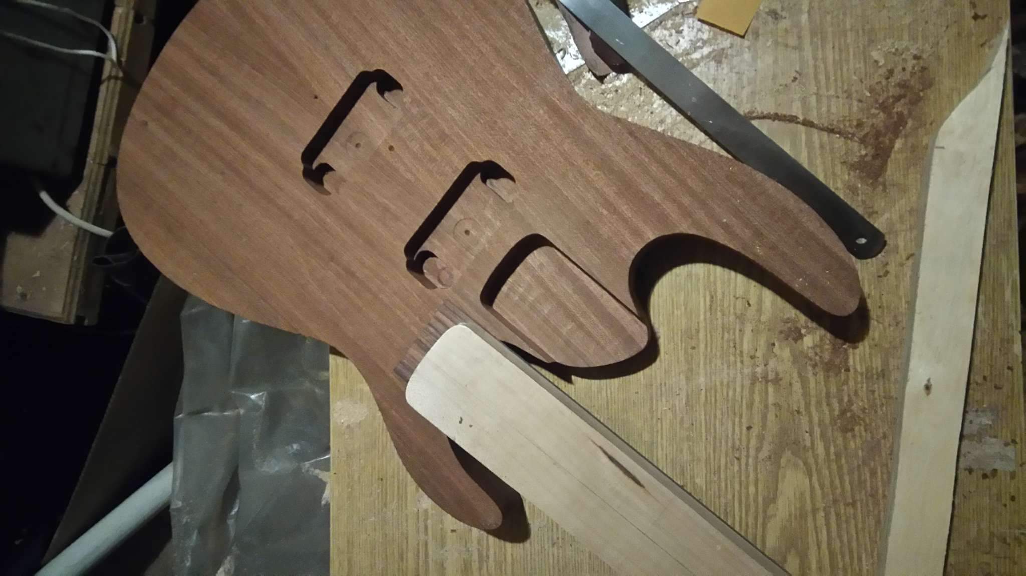 Две фанеры не менее 12 мм ровными торцами тулишь по краям грифа, в районе бриджа накрываешь их третьей фанеркой и фиксируешь их. Далее крепишь это на корпусе, оринтируешь, зазор регулируется путём передвижения грифа в этой приспособе. Крепишь ещё фанерку-вставку для ограничения пятки грифа и фрезеруй по подшипнику.