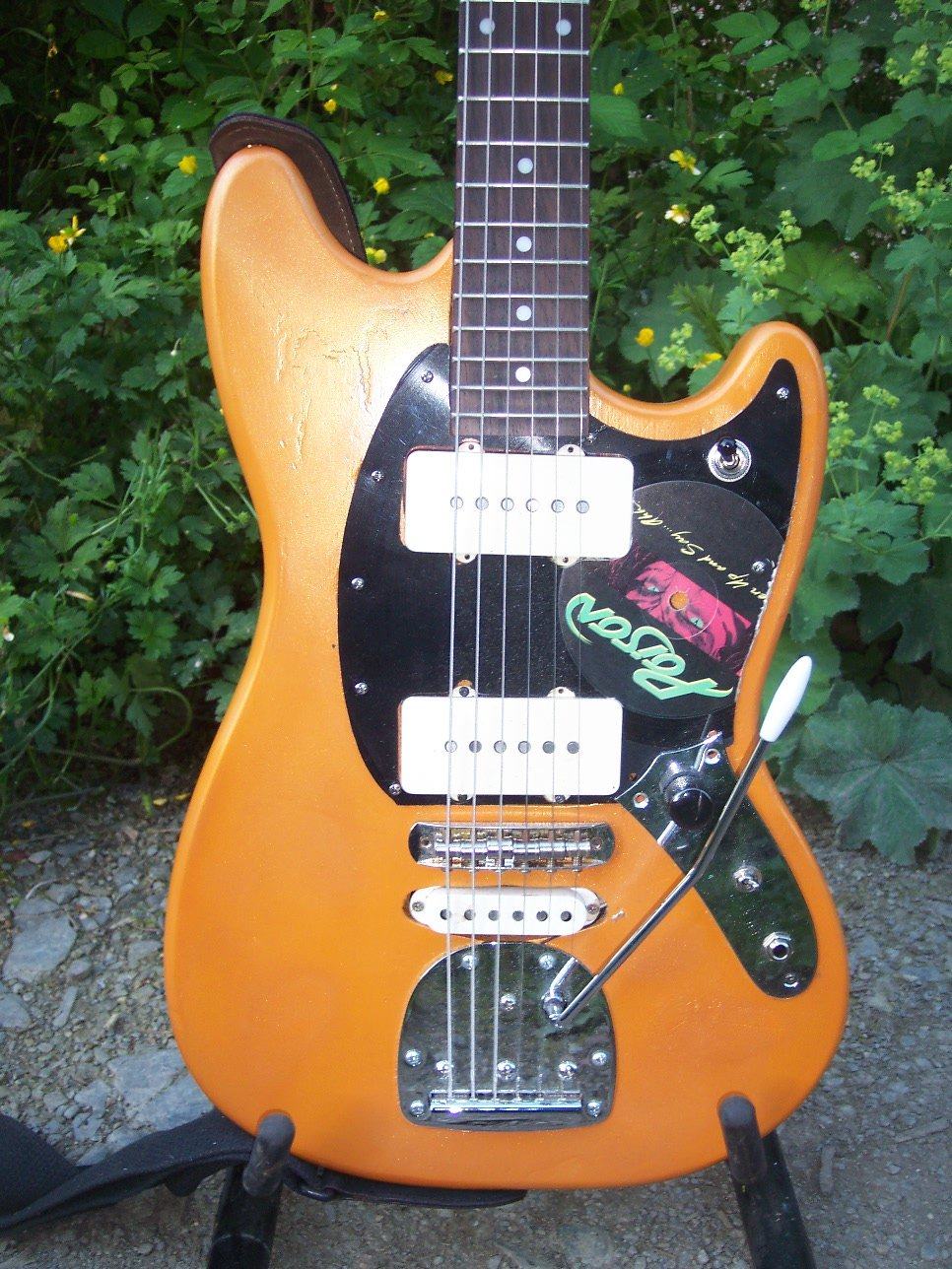 По незнанию для этой гитары был заказан пикгард от джазмастера (думали что они одинаковые), пришлось выкручиваться, поэтому обводы панелей отличаются от оригинала