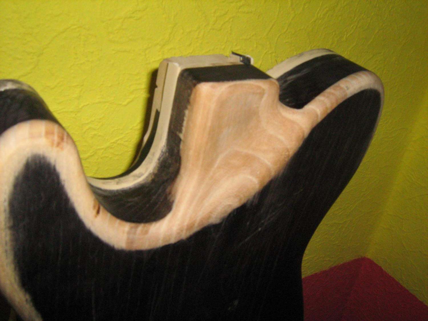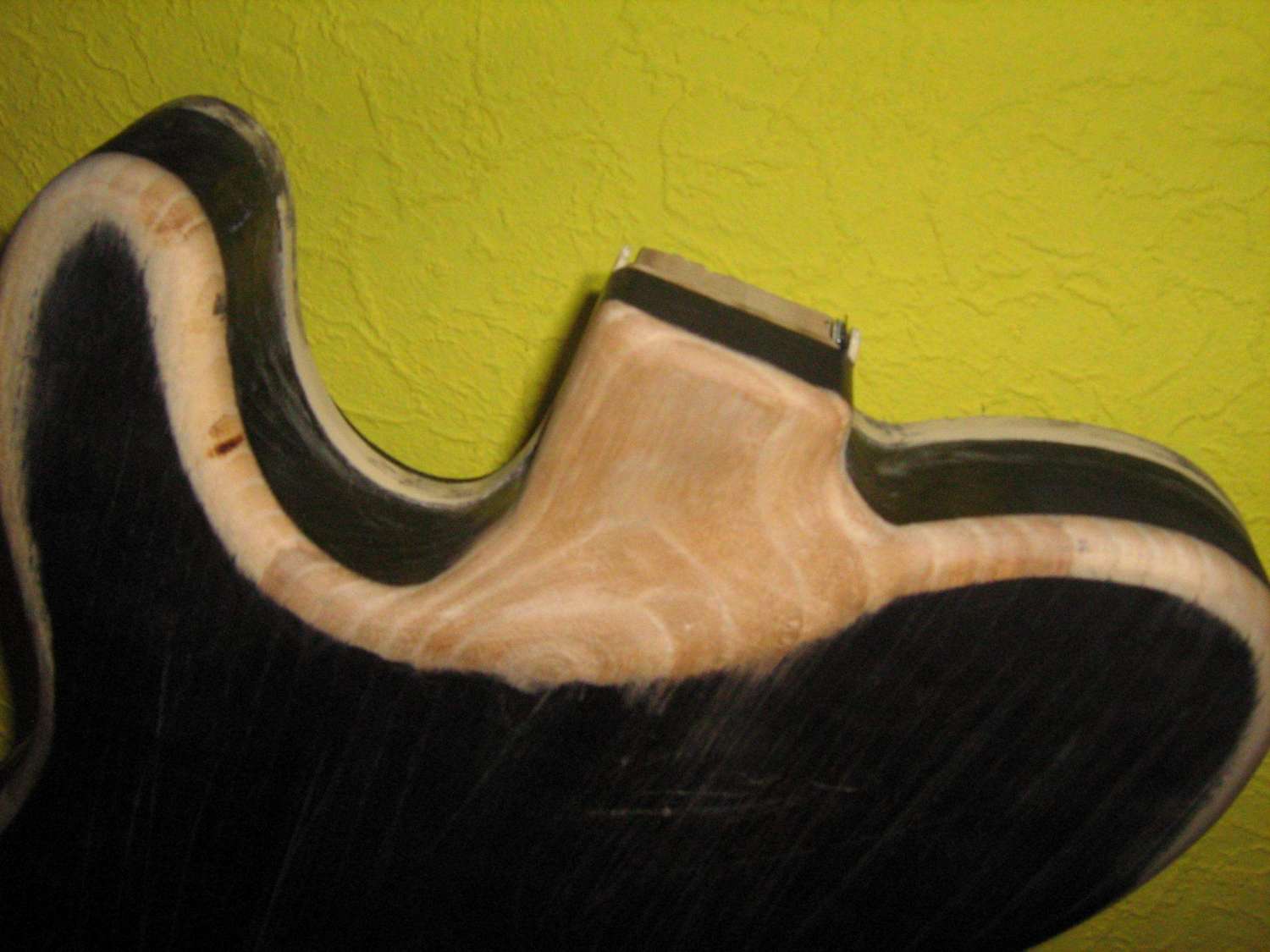 Затем мне внезапно захотелось намазать гитару бейцем, заодно проверить, подходит-ли в качестве морилки шеллачный грунт с этим самым бейцем. Ну и будет-ли смотреться окантовка с черным финишем. Это к тому, что обращать внимание на "о-черт-что-это-за-черная-хренотень" не стоит. зы Я запамятовал, что закреплял ворс на липе жидехонькой нитрой, поэтому и вид такой вышел. Я не шибко фиксировал этот процесс на фото, но скажу, что ясень буду морить со спиртом, или, на худой конец с ацетоном, такой он, гадина, неуморимый: