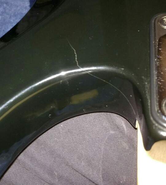 Лак так не трескается. Обычно на плоскость не переходит, только в роге 1-2 см максимум. В случае если плотно сидит гриф, или его зажало в следствии деформации дерева. Или удара грифа в сторону.