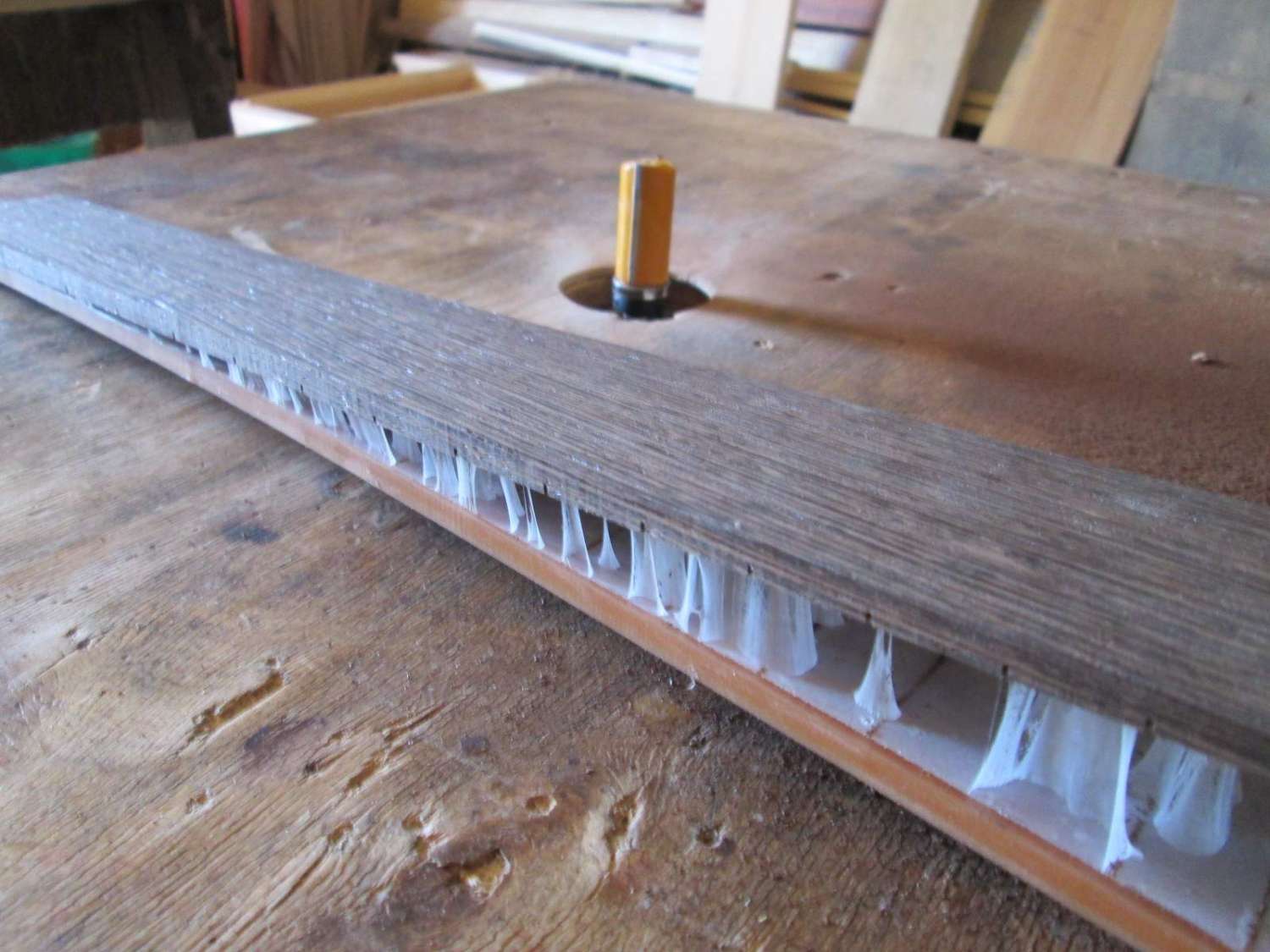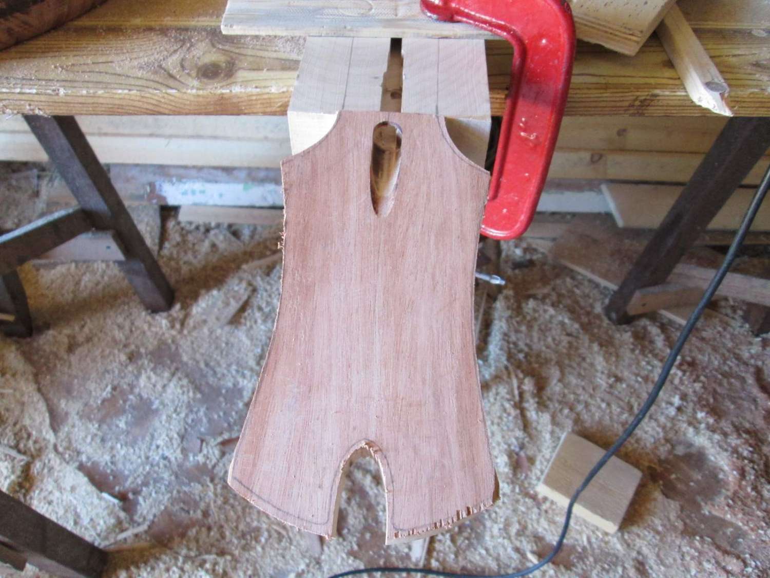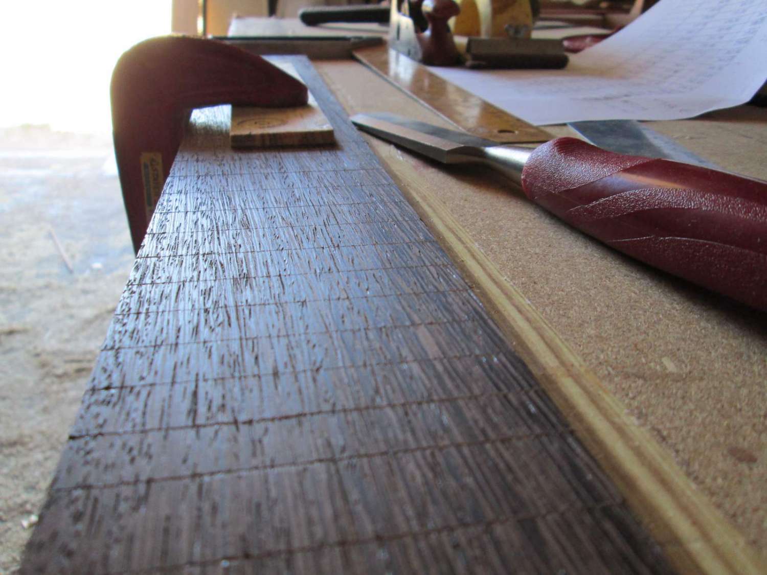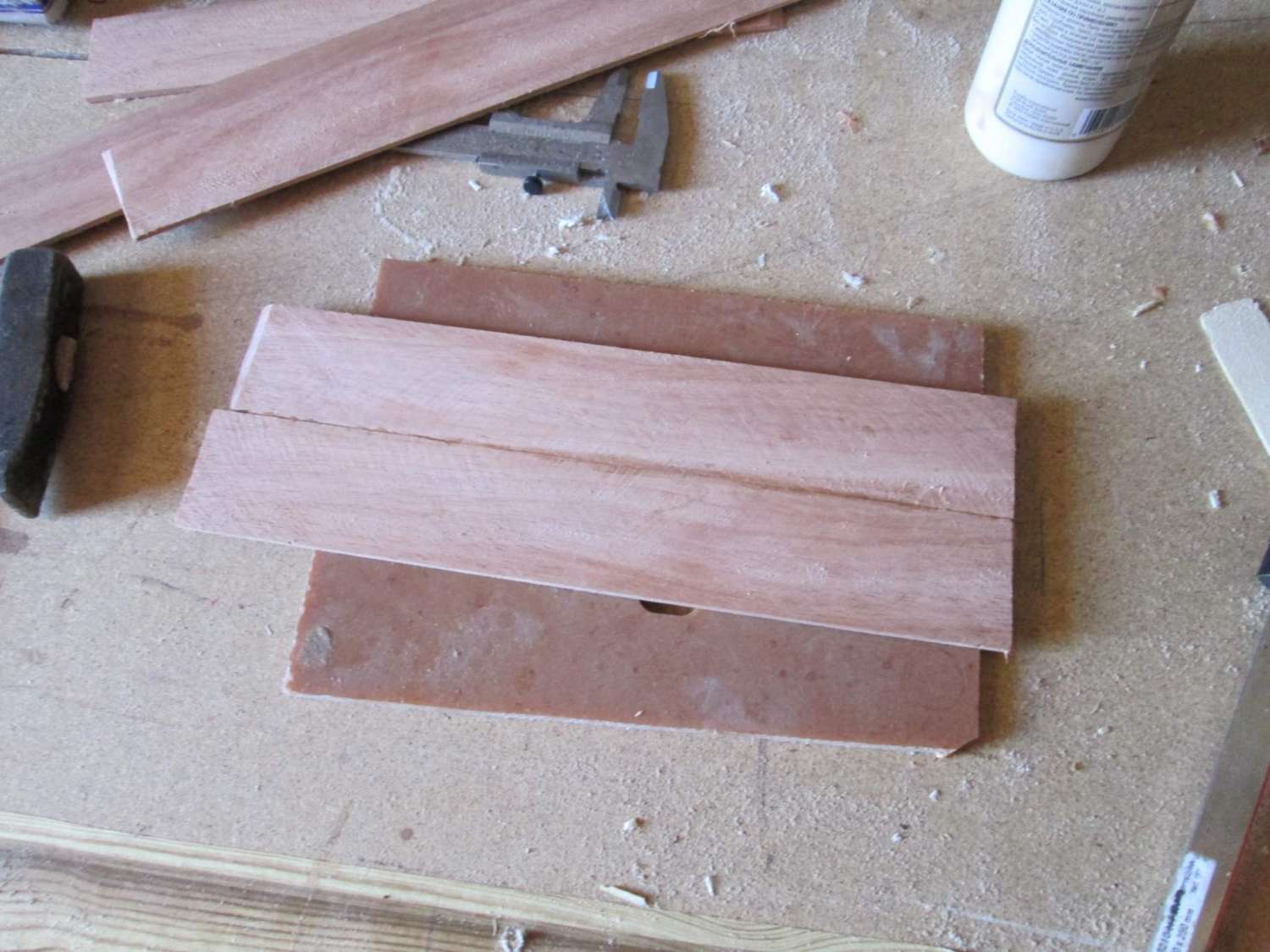 Тааак. На перо приклеим шпон махагона, который сначала надо склеить из пластин нарезанных с обрезков, полученных после выпиливания корпуса...