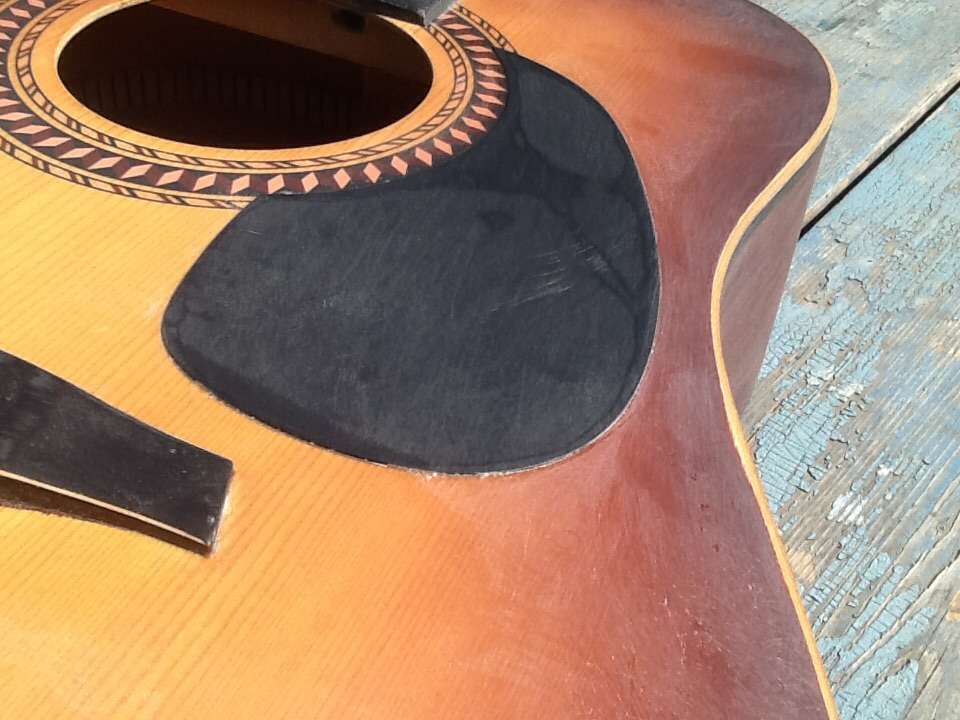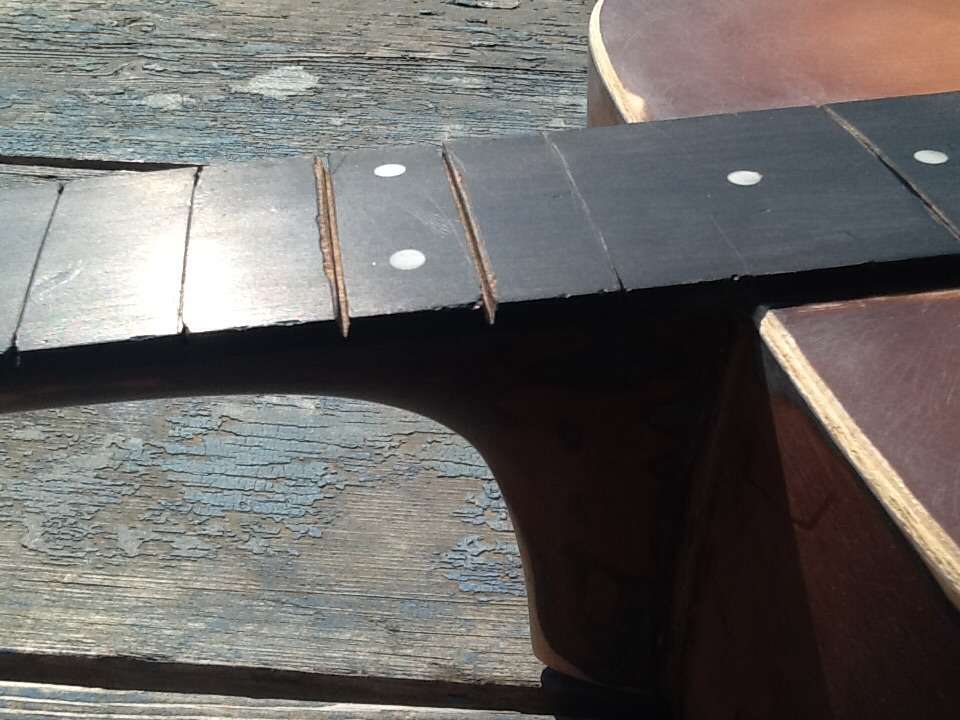 Гриф однозначно обдираем до дерева, чтобы оценить масштаб "мастерства". Верхнюю деку тоже. Розетка, скорее всего, уйдёт, так как похожа на аппликацию. Потом можно наклеить новую и залить деку прозрачным лаком. Гриф либо под прозрачный лак, либо в тёмный цвет, наглухо, только аккуратнее, чем сейчас. Пропилы под лады разбиты, поэтому новые придётся вклеить на любой обратимый клей.
