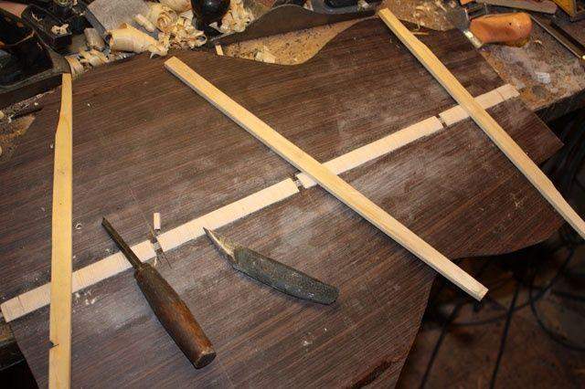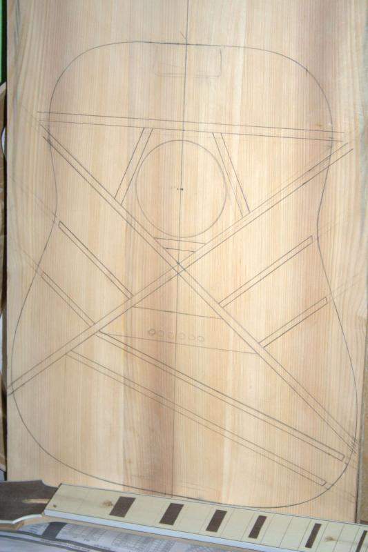 Точно перенести схему не получится. ОМ-не дредноут. Подходи творчески. Есть 2 клеца верхний , к которому крепится гриф, и нижний. Проведи вертикальную ось так ,чтобы она соответствовала осевой грифа. Далее промеряй размеры голосового отв. на старой деке и его место расположения.. Диаметр может быть 100-110 мм.Больше делать нет смысла, но и 98 ,как на схеме маловато.Диаметр голосника связан с подачей басов.Верхнюю пружину которя идет над голосником перпендикулярно вертикальной оси установи в соответствии с размерами получившегося голосника.Можно немного приподнять. От нижней точки голосника до перекрестия 25-28мм Это важно, на" буржуйских" форумах это расстояние рассматривают ,как эталон.Все , что вокруг голосника размещай по месту, совсем близко к краю отверстия не лепи, но и не убегай далеко, это усиление голосового отв. У Валеры Ващенко в последней акустике голосовое отв. усилено деревянным, специально выстроганным "бубликом" (пусть простит меня Ващенко за сравнение, это не мое, где-то уже встречал такой оборот) ,так вот, функции у него теже, укрепление краев отв. и распределение нагрузки. Обрати внимание Х пружина врезается в верхнюю контр обечайку она длиннее всех остальных и несколько выходит за контур корпуса.Это делается для точного определения места врезки при предварительной установке деки на корпус. На схеме хорошо видно, что проекции верхних концов Х пружины не пересекаются с вержней пружинкой идущей перпендикулярно вертикальной оси. Там расстояние явно больше чем у тебя , Попробуй решить эту задачу., а остальное распредели пропорционально размерам корпуса, глядя на схему.Я думаю все получится.