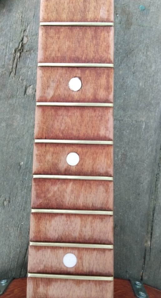 На лады залез кистью после 14 лада... . Удивился что удалось созранить чистыми остальные лады. Потому что казалось, что кистью невозможно закрыть между. Но лак тягучий и слепляет ворсинки вместе.