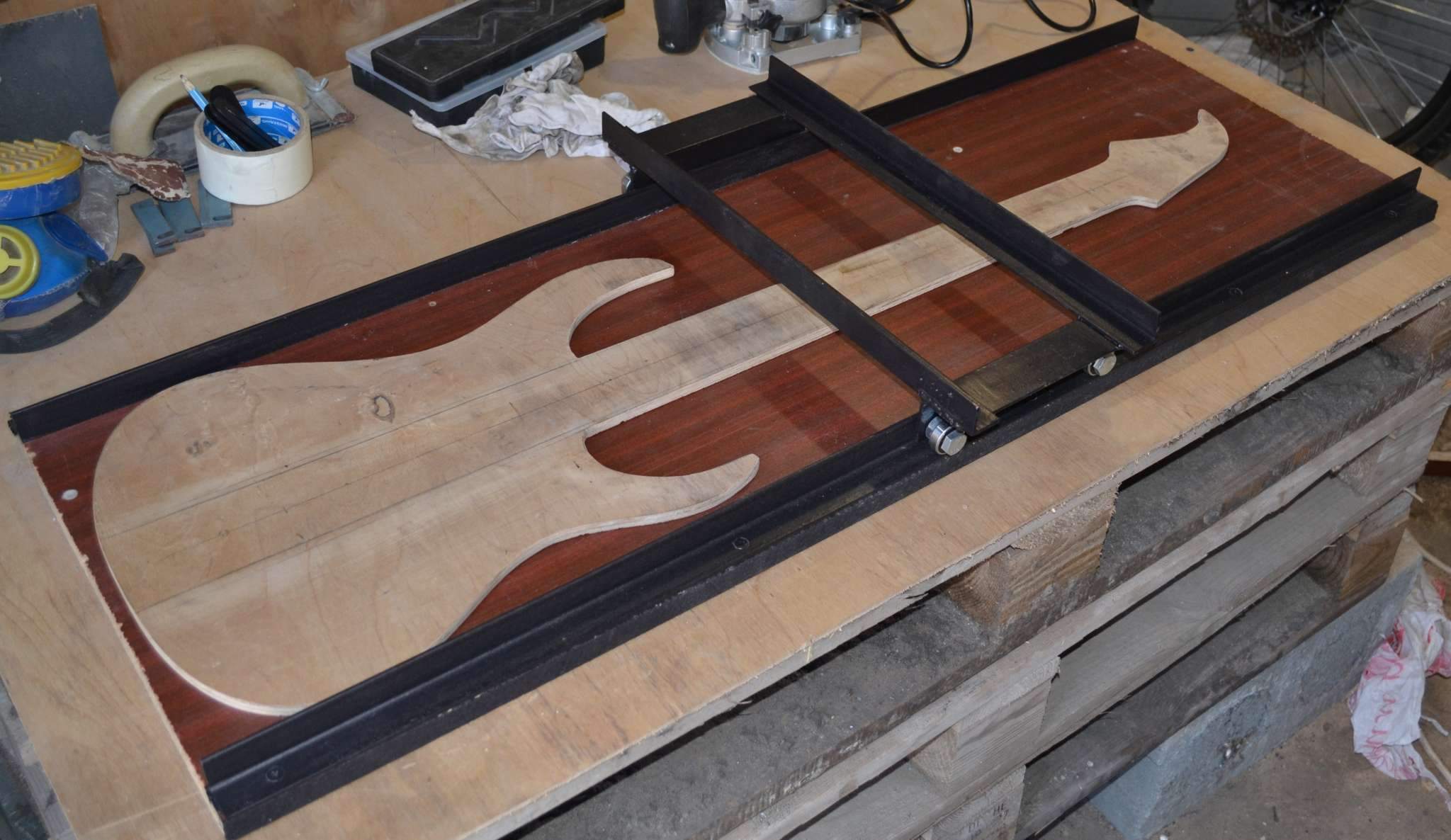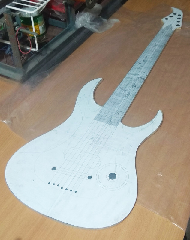 3) Полноразмерный шаблон гитары (скорее всего, его придется распилить на деку, гриф и голову грифа для удобства фрезерования), т.к. везде будет разная толщина.