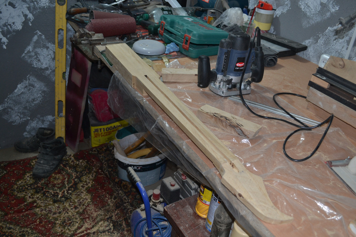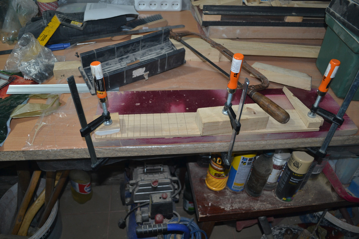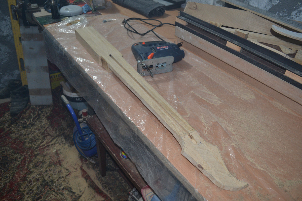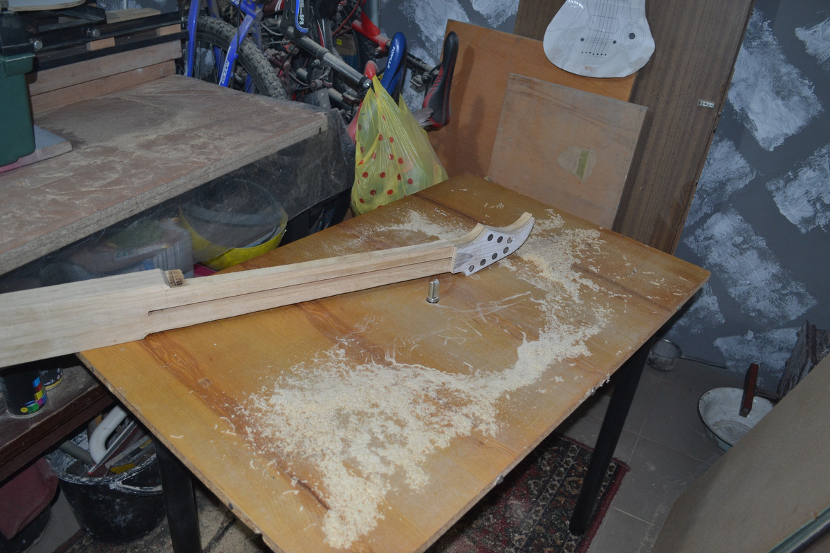 Решил не придавать геометрию грифа, а сразу же клеить, т.к. после распила и переворота средней части бруски чуть повело, и остальные 2 плоскости будущей заготовки, естественно, не совпали (та на которой будет накладка и противоположная). Затея ровнять бруски, выпиливать и пытаться ровно склеить - показалась адски трудоёмкой, к тому же, есть огромное количество моментов, где легко можно накосячить. Да ещё и после таких манипуляций, в случае чего, выровнять плоскость, где будет накладка, станет для меня невозможным. Зато теперь после высыхания переклея, кину полученную заготовку целяком на фрейзмус и прогоню плоскости. Геометрию потом сделаю или тем же фрейзмусом, или сначала выпилю с припусками, на черновую, и доведу фрейзмусом.