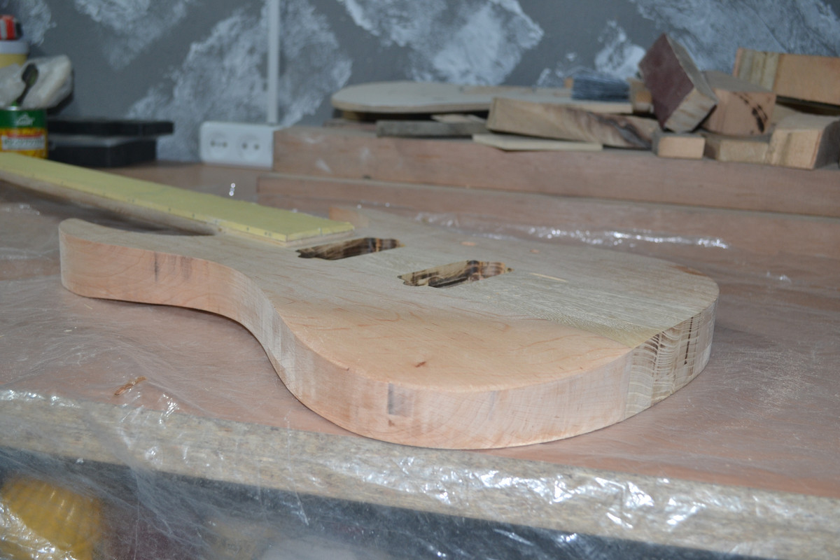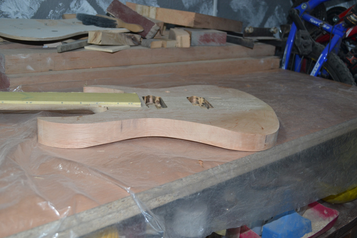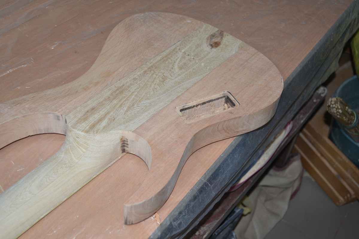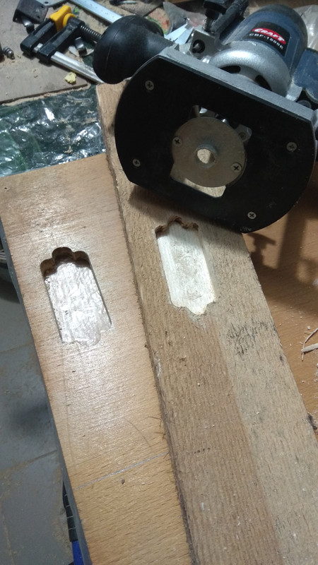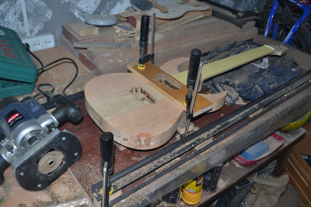 В общем, сделал вчера шаблон для фрезеровки ниш под датчики. Всё очень просто, намного проще, чем казалось. Шаблон делал следующим образом: начертил в автокаде чертеж, с учетом разницы под копировальную втулку, распечатал, приклеил на заготовку, обчертил, и по линиям, при помощи фрезера и параллельного упора благополучно всё это дело выфрезеровал. Опробовал на "черновике", результат - огонь! Далее, уже сегодня, наклеил шаблон при помощи 2-х стороннего скотча на деку, дополнительно прижав струбцинами для подстраховки, и также благополучно выфрезеровал ниши. Сверло форстнера не понадобилось.