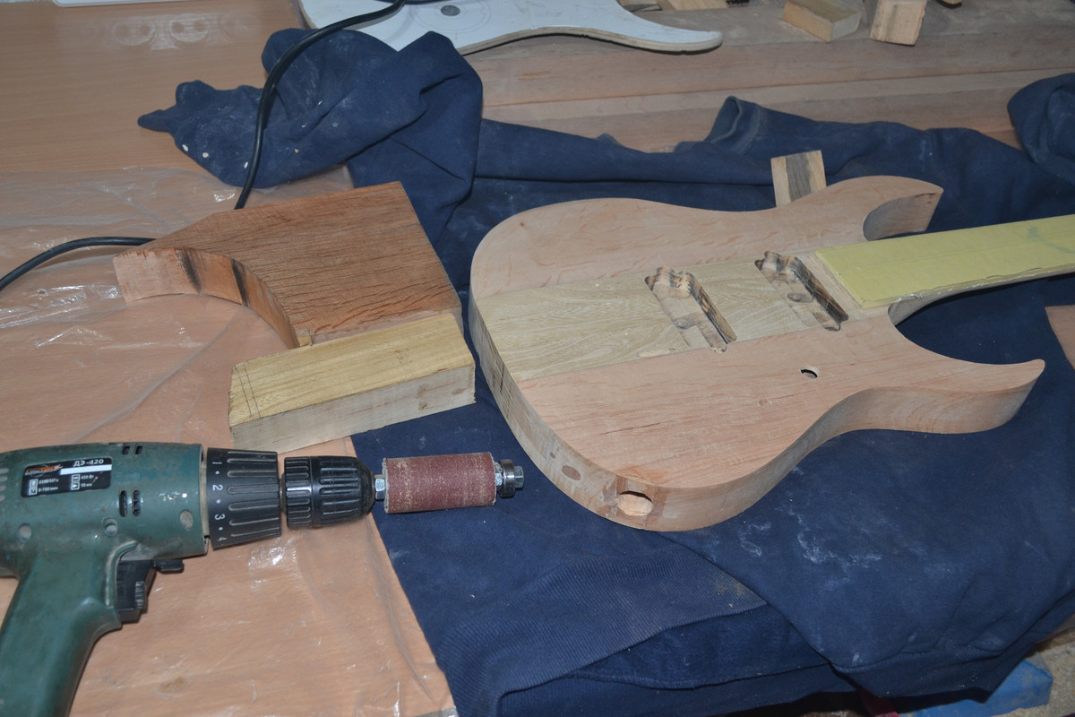 По самой процедуре покраски думал так: несколько слоев прозрачного лака по всей гитаре, в качестве грунта. Затем шлифовка, заклеивание грифа молярной лентой, и несколько слоёв тонированного лака по деке и голове грифа. Шлифовка. И финальных несколько слоёв прозрачного лака по всей гитаре.