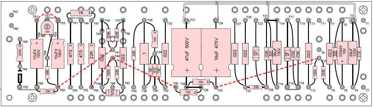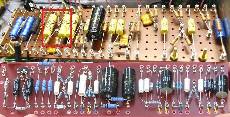 Так же в JTM45 разделительные конденсаторы после ФИ имеют номинал 100нан. Их я тоже обозначил красной рамкой: