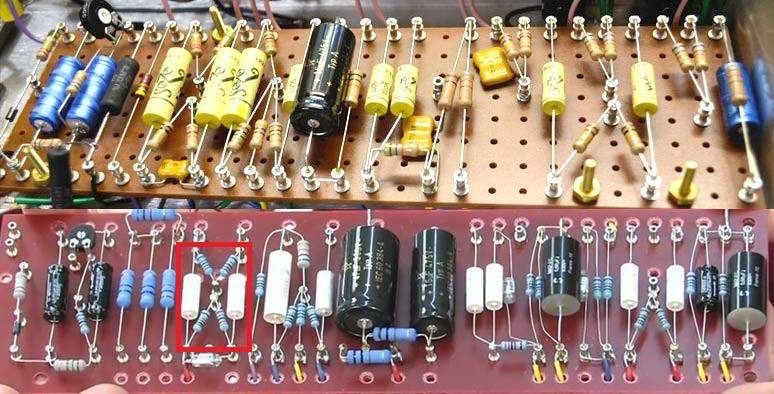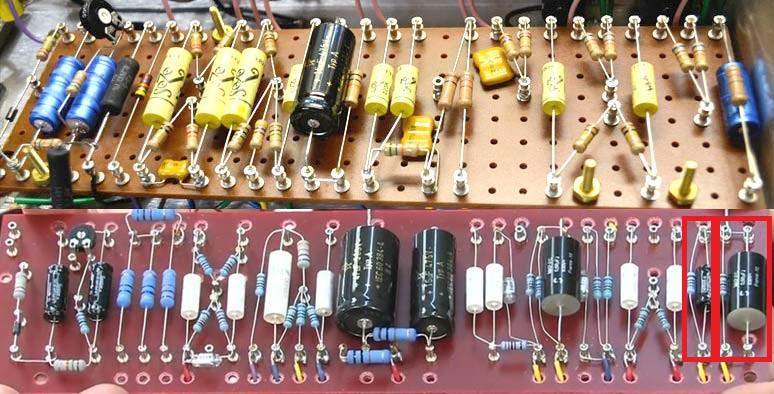 В более поздних моделях маршаллов плекси 1987 и 1959, катоды первого каскада каждого канала имеют собственные катодные элементы, на канале "нормал" остались те же самые 820/220мкф,